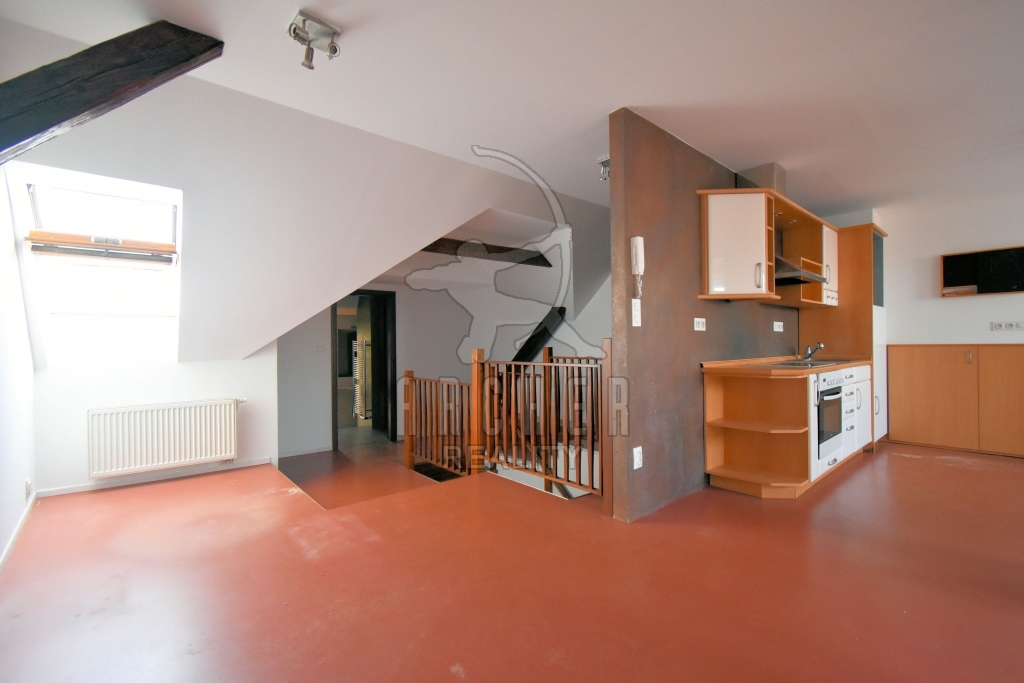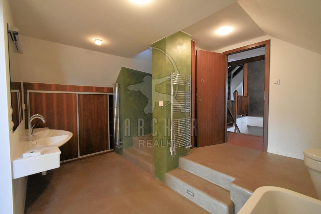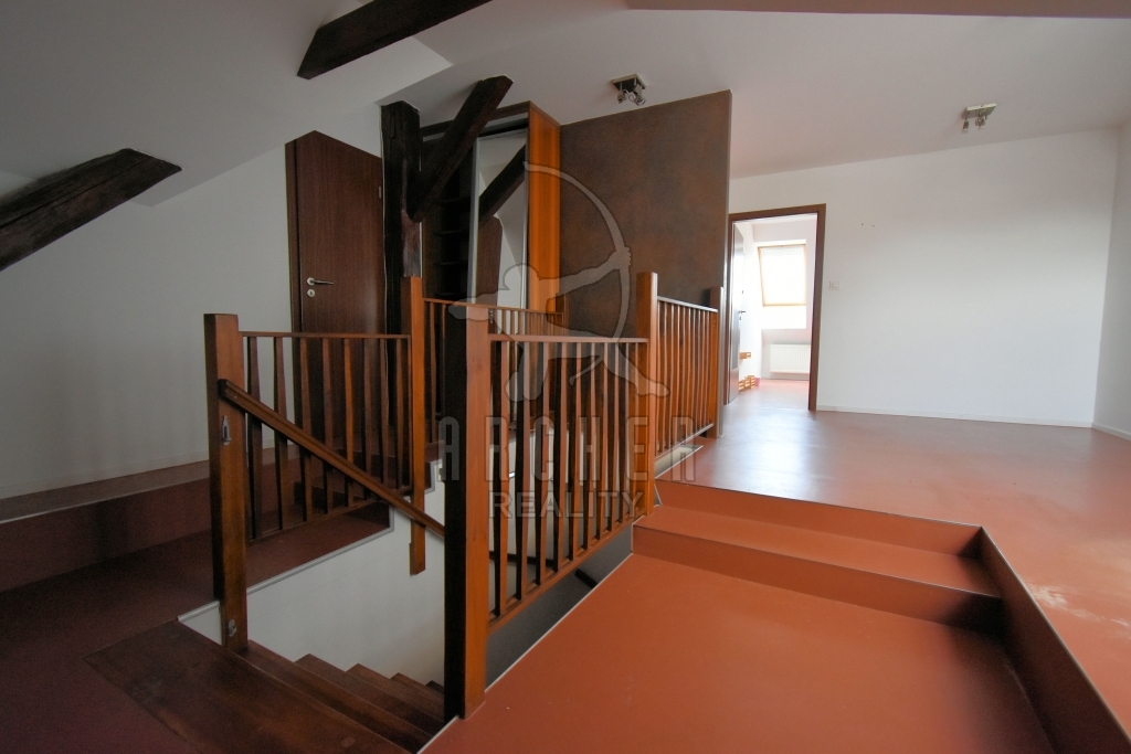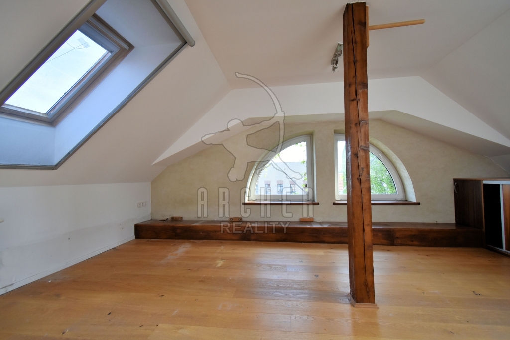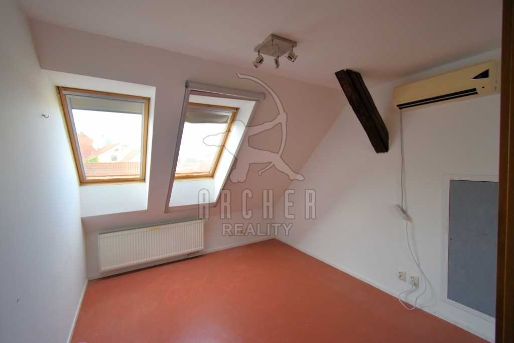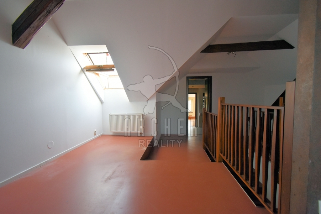 Hlavní vstup do domu propojuje 2NP s kancelářemi o dispozici 4 místností, kuchyňkou, sociálním zázemí vč. sprchového koutu a toalet (vč. točitého venkovního schodiště s přístupem do zahrady) o celkové ploše 94m2 a 3.NP, kde je vytvořený podkrovní vzdušný byt o výměře 104,5m2 s dispozicí 3+kk vč. šatny (atypicky řešený klimatizovaný byt s prostorným obývacím pokojem s plně vybaveným kuchyňským koutem, pokojem/pracovnou a prostornou ložnicí. Koupelna s vanou a sprchovým koutem společně s toaletou). Vytápění zajišťují 2 samostatné plynové kotle ( radiátory).