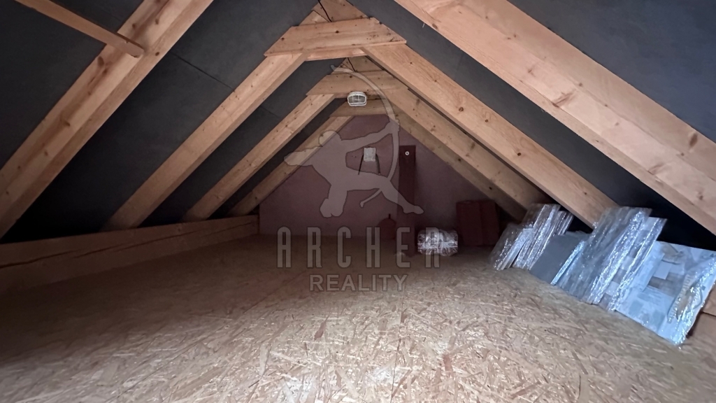 V patře domu se nachází další tři neprůchozí ložnice a velká koupelna s vanou, sprchovým koutem i WC. Z tohoto patra se můžete po skládacích schodech dostat i do pochozího podkroví, které nabízí velký úložný prostor nebo se zde může dodělat další obytná místnost.