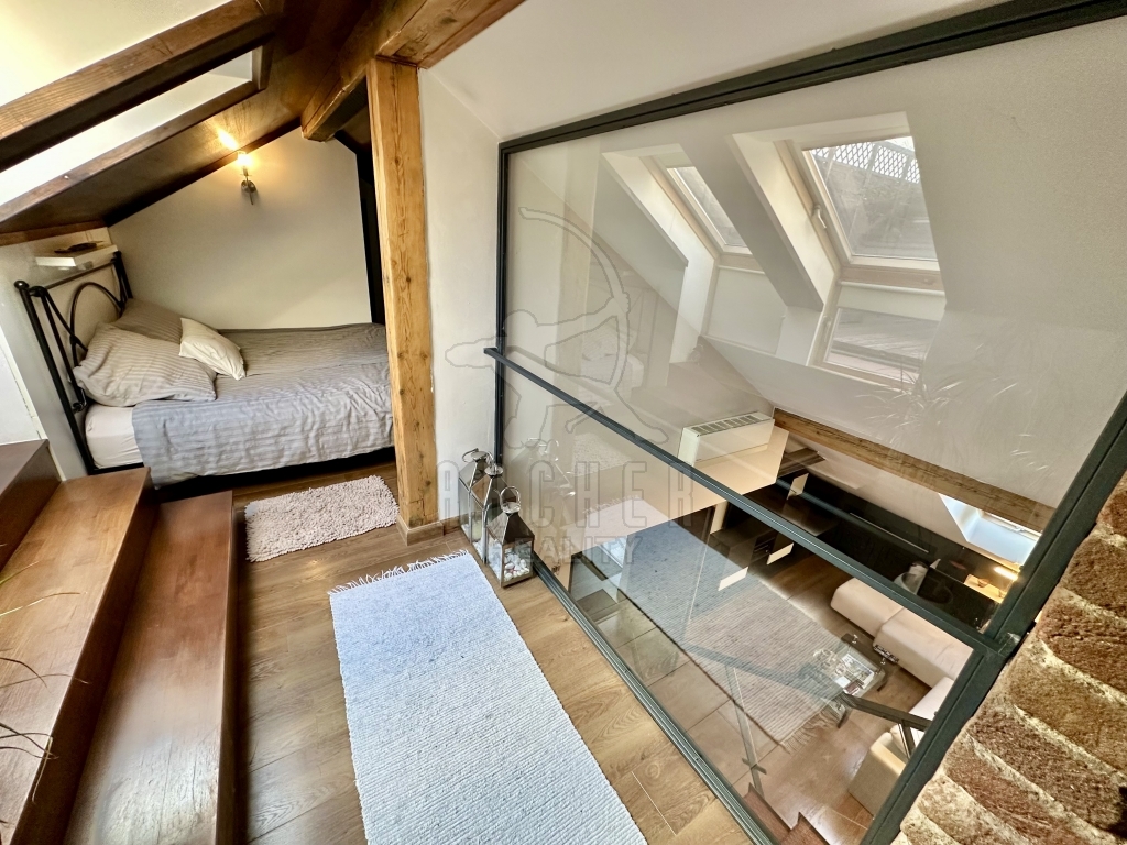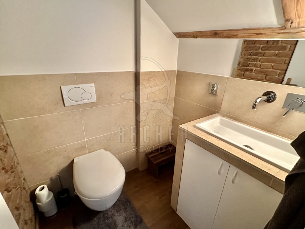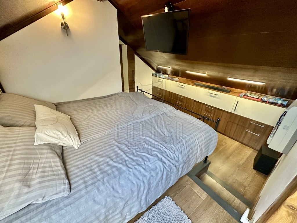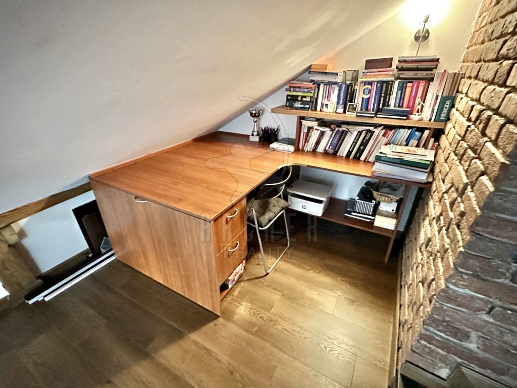Velký pokoj, tedy denní část je osvětlen ze dvou stran a plynule navazuje na kuchyň, jež je bokem a nenásilně komunikuje s okolím. Dominantou je kovové, prosklené schodiště propojující noční/ soukromou část se střešní terasou. Malá pracovna, útulná ložnice a praktická šatna je za velikým proskleným portálem s pohledem na obývací část. Celkově je prostor přehledný krásným designem, má příjemnou atmosféru a působí útulně.