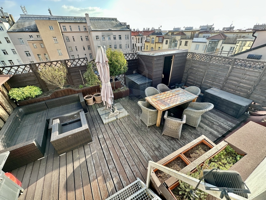 Soukromá střešní terasa je zážitek, vzrušení a luxus. Velké posezení, výhled na celou Prahu.