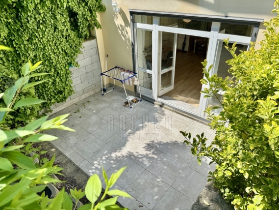 Prostorný mezonetový byt s terasou a vstupem do zahrady. V klidu dvora pěkného činžovního domu se nachází moderní byt 3+1 s velkorysým obývacím pokojem, prosvětleným velkým francouzským oknem, za nímž je terasa a vstup na zahradu s posezením. Na obývací pokoj navazuje kuchyň s linkou se zabudovanými spotřebiči a linkou do písmene L a je zde také jídelní stůl. Na rozhraní obývacího pokoje a kuchyně stoupá vzhůru točité schodiště s masivními dřevěnými schody.