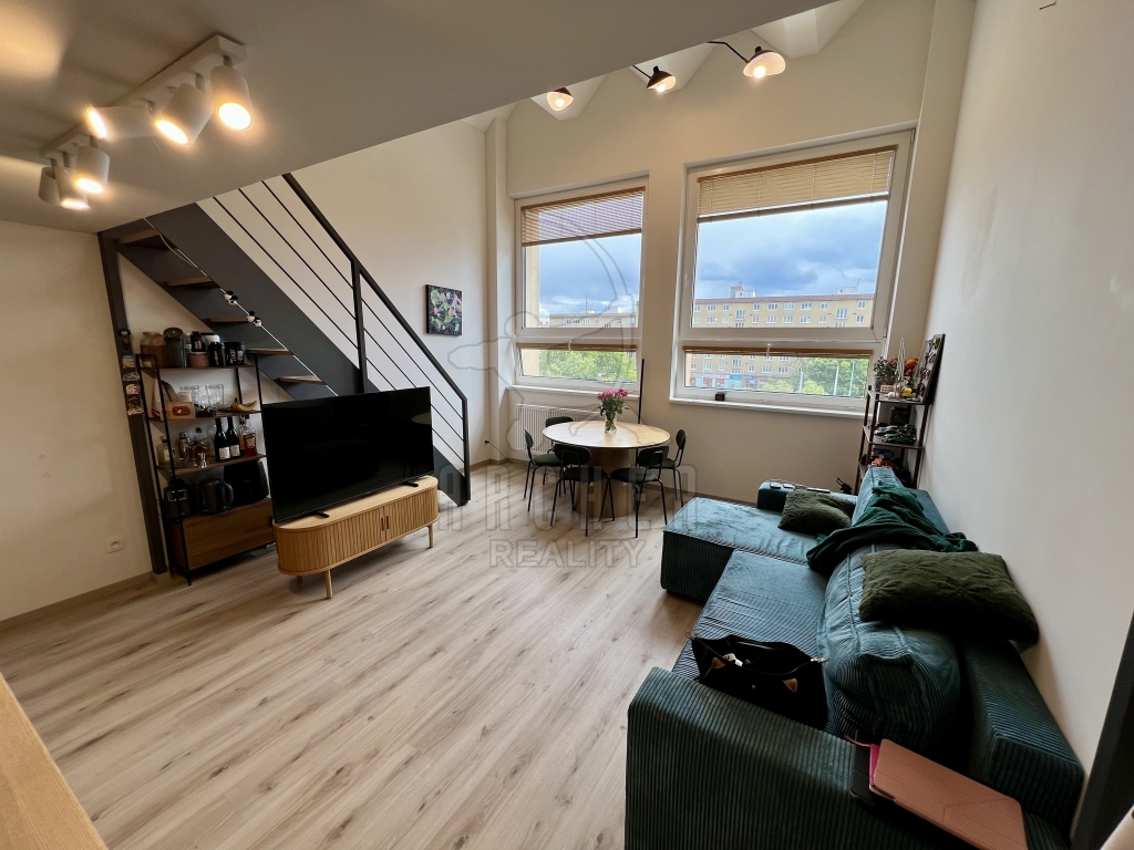 Zajímavě zrekonstruovaný byt se nachází v designové budově vprostřed Kubánského náměstí. Otevřený, vysoký prostor umožnil vytvořit krásné loftové bydlení. Ze společných prostor vstoupíme do zádveří, které se postupně otevírá do šířky a především do výšky až 4,3 metry. Prostor je - jako každý správný loft - částečně rozdělen do dvou pater. Spodní část slouží jako společenský prostor s kuchyňskou linkou na míru a obývacím prostorem, v galerii přístupné po schodišti pak nalezneme ložnici, organicky propojenou s pracovnou. Celá stěna za manželskou postelí se skládá z vestavěných skříní. Obě patra zalévá světlo ze dvou ohromných oken v jižní orientaci s fascinujícím výhledem na celé Kubánské náměstí. Byt samozřejmě nabízí koupelnu s vanou a toaletou, v podzemním patře je k dispozici zděný sklep. Při zařizování byl kladen důraz na vysokou kvalitu materiálů a spotřebičů - po celém bytě jsou dřevěné plovoucí podlahy. Byt se nabízí včetně většiny mobiliáře.