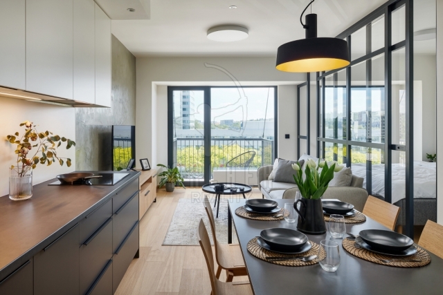 Nový světlý byt ve 4. NP s výhledem nad střechy domů se nachází v čerstvě dostavěném projektu SO-HO v Holešovicích. Byt je v moderní, kvalitně postavené budově s velkými schodišti a chodbami. Obytná místnost je prosvětlená dvěma francouzskými okny, levým se vchází na balkon. Okna mají nadstandartní kvalitu, protože mají hliníkové rámy a trojskla.