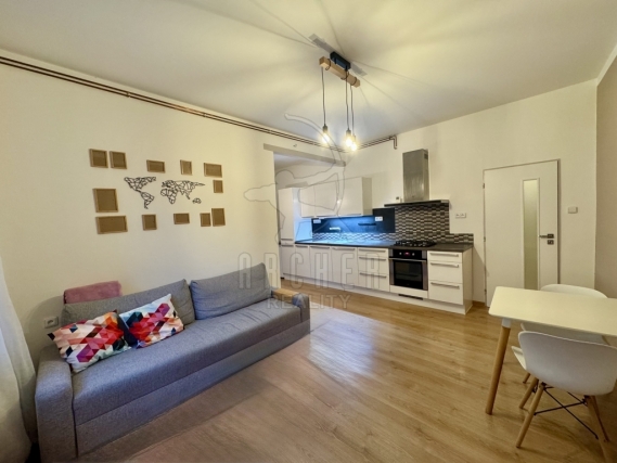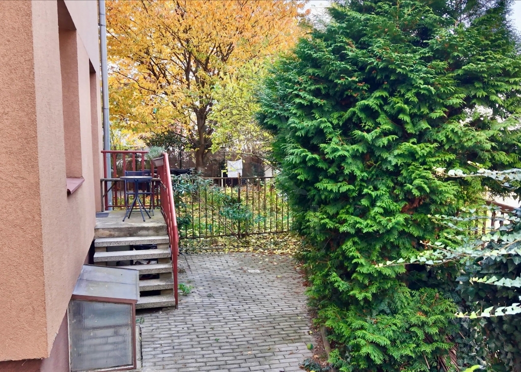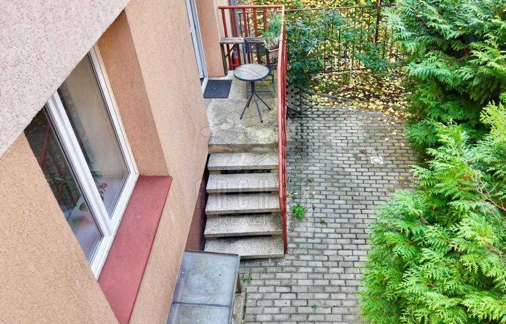Obývací pokoj má přímý vstup na terasu s posezením. Z terasy vedou schody na dvorek a zahradu domu. Oboje je odděleno od ulice domem. Kuchyňská část obývacího pokoje je vybavena kuchyňskou linkou s vestavěnou horkovzdušnou troubou, plynovou varnou deskou a volně stojící ledničkou s mrazákem. Je zde také jídelní stůl s židlemi. Obývací část je vybavena sedací soupravou a u protější zdi je televize. Ložnice má také výhled do zeleně dvora a vejde se do ní dvojpostel a stůl či šatník.