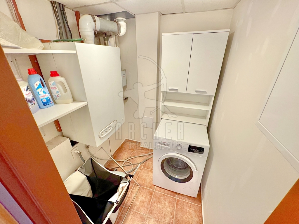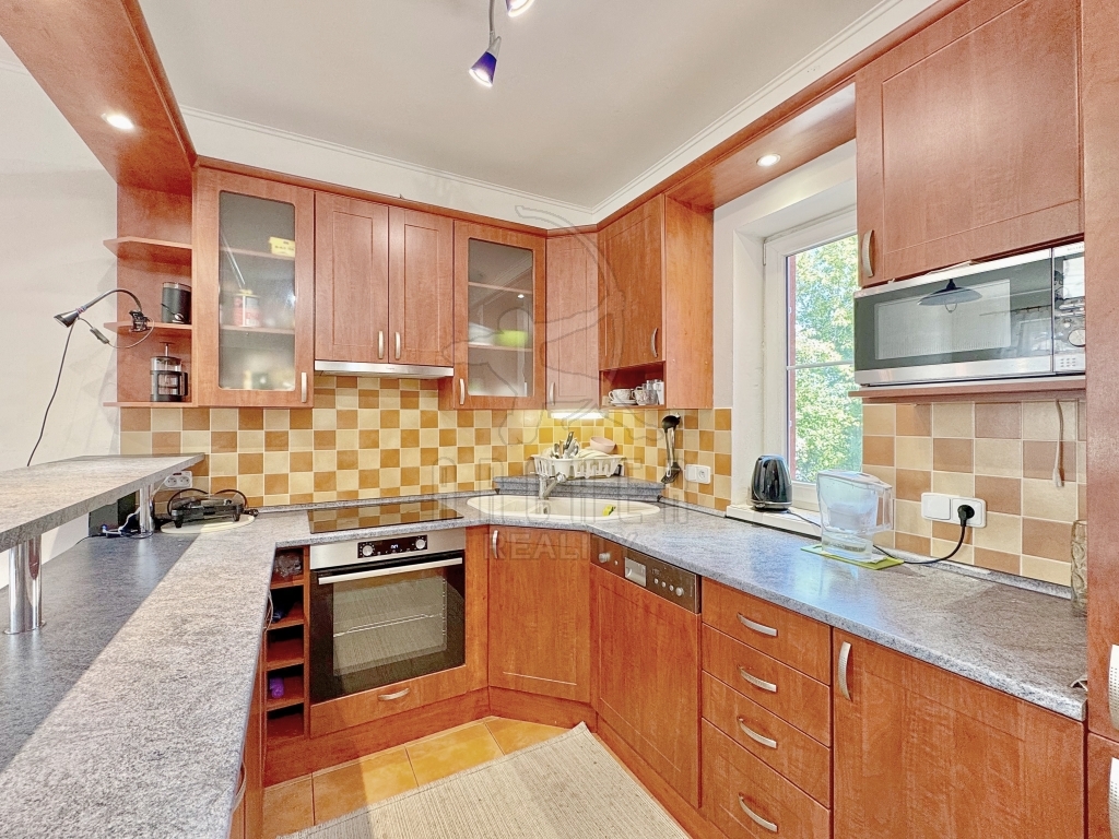 Tento mezonet má tři chytře řešená podlaží, propojená elegantním točitým schodištěm s masivními bukovými schody.