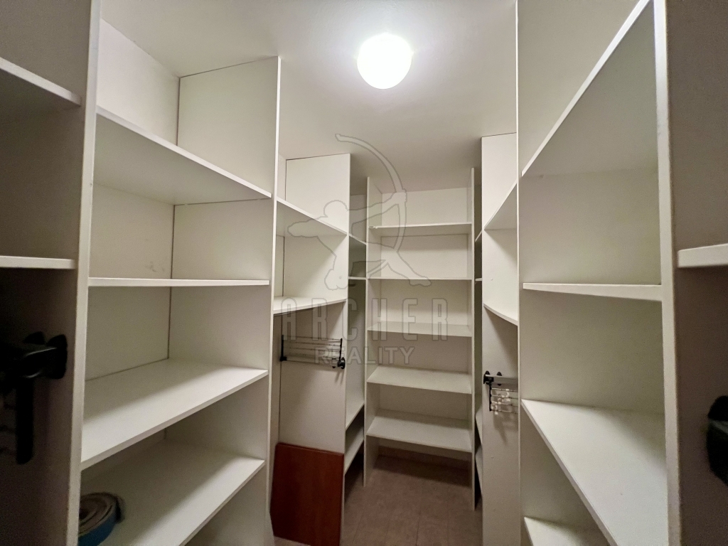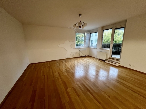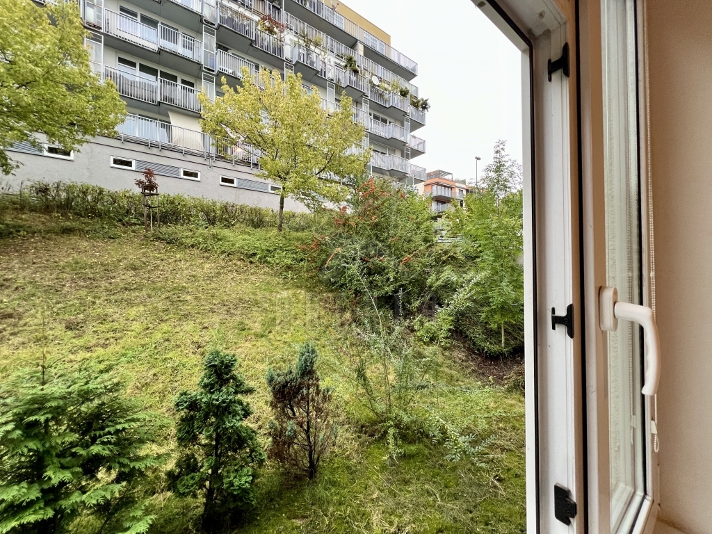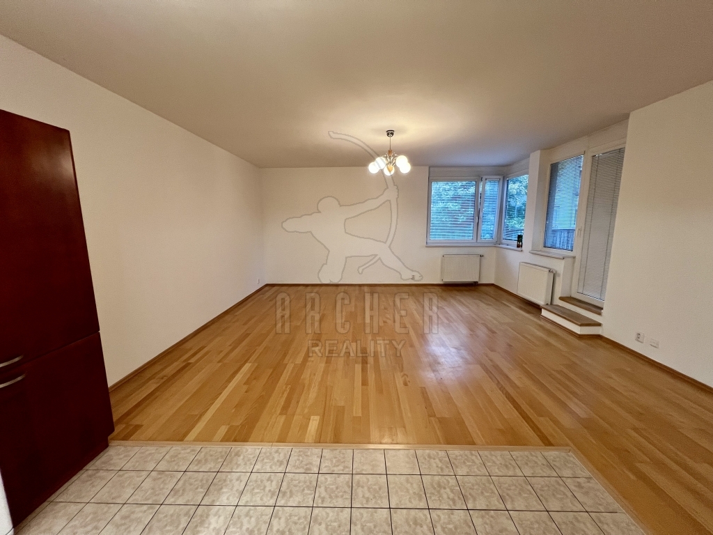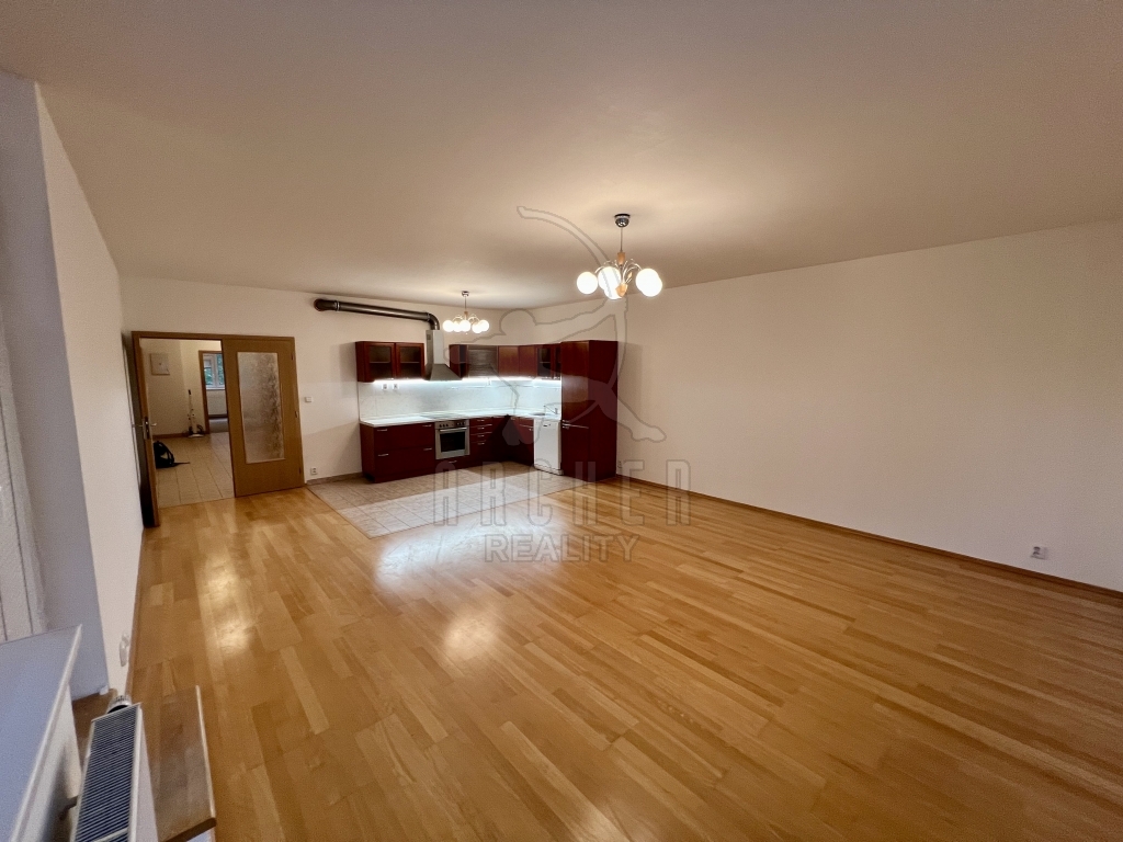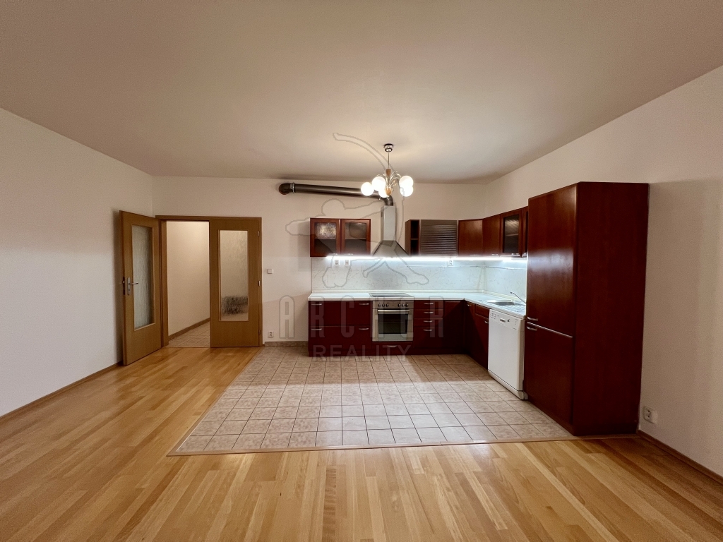 Ze společných prostor vstupujeme do podlouhlé a zároveň příjemně široké chodby, která slouží jako hlavní komunikační tepna, nabízí ale také dostatek místa pro vestavěné skříně. Pojďme se však podívat na jižní stranu bytu. Ohromný pokoj o 40m2 nelze nazvat jinak než tanečním sálem. Tento prostor je předurčen pro bohatý rodinný či společenský život. Kuchyňský kout do tvaru L disponuje všemi moderními spotřebiči, na druhé straně místnost ústí na příjemnou terasu (6,7m2) s výhledem do přilehlého parčíku. Severní strana bytu disponuje dvěma pokoji (10m2 a 15m2), které lze pojmout jako dvě ložnice, ložnici a dětský pokoj či pokoj a pracovnu. Oba mají moc pěkný výhled do svažité zeleně. Byt nabízí ještě mimořádně prostornou koupelnu s vanou a samostatnou toaletu. Skutečnou perlou je ovšem rozlehlá walk-in šatna v samém středu jednotky. Ač je poloha bytu deklarována jako první podlaží, díky umístění nad patrem s garážemi se jedná de facto o prvním patro. Součástí prodeje je i parkovací stání přímo v domě.