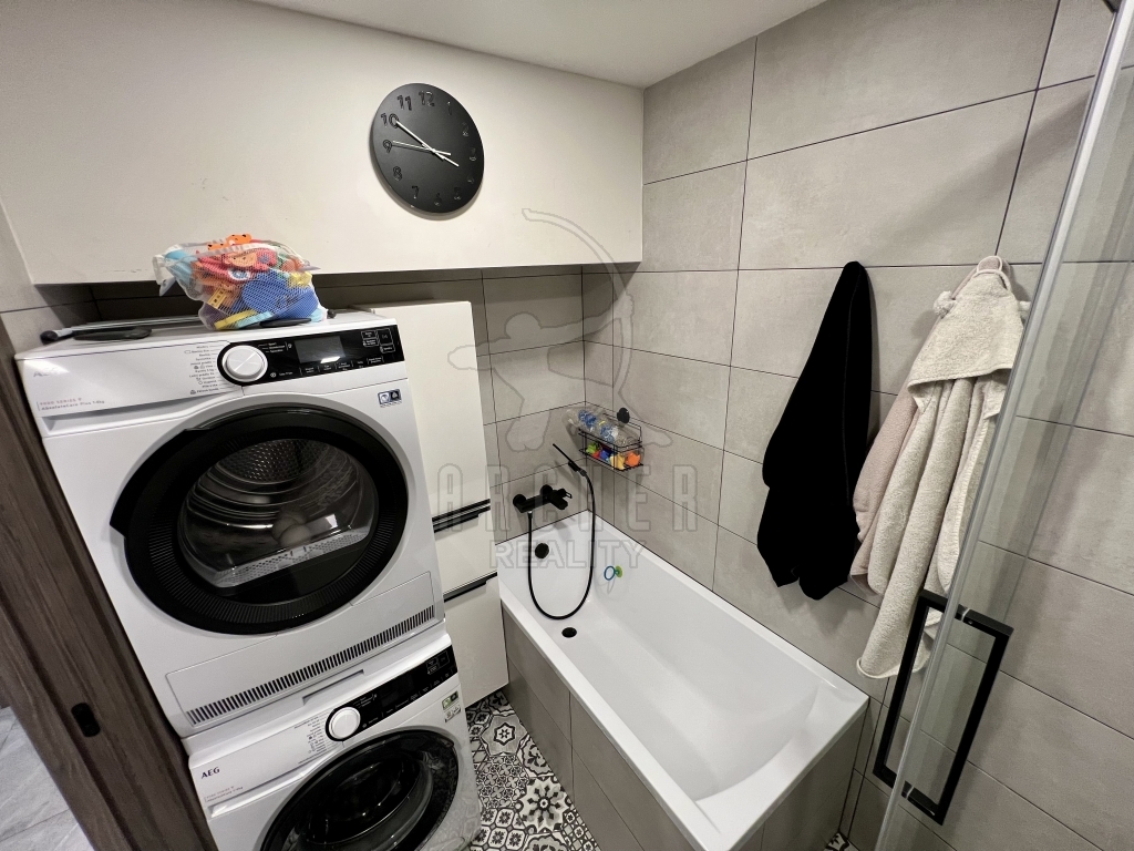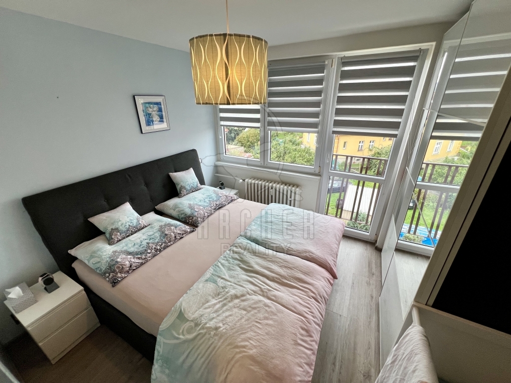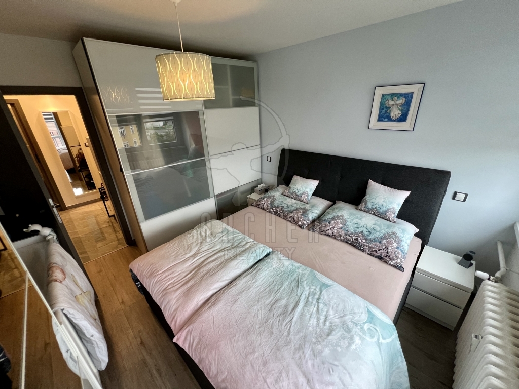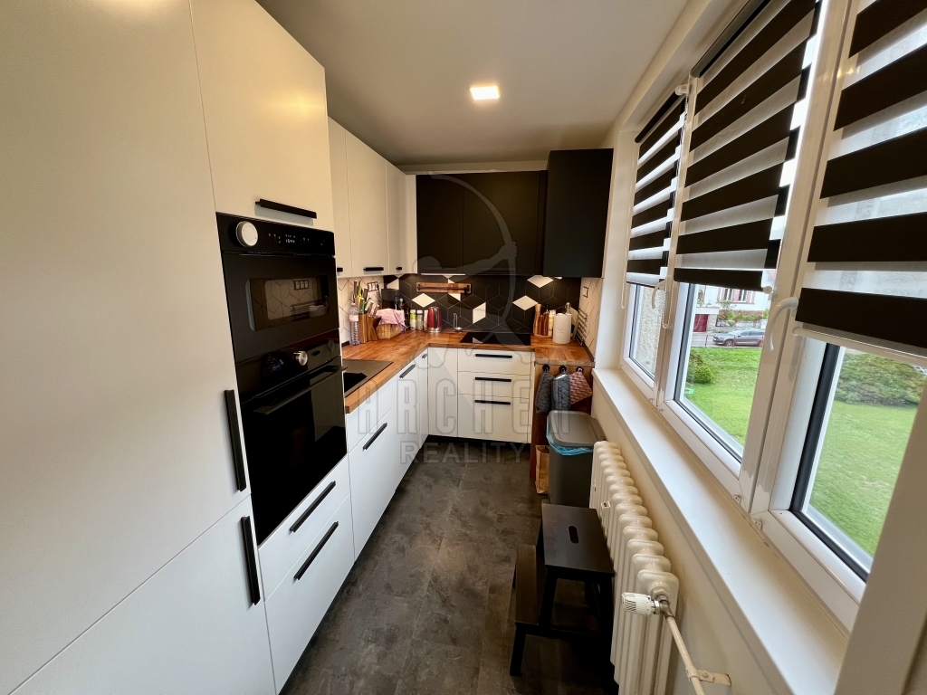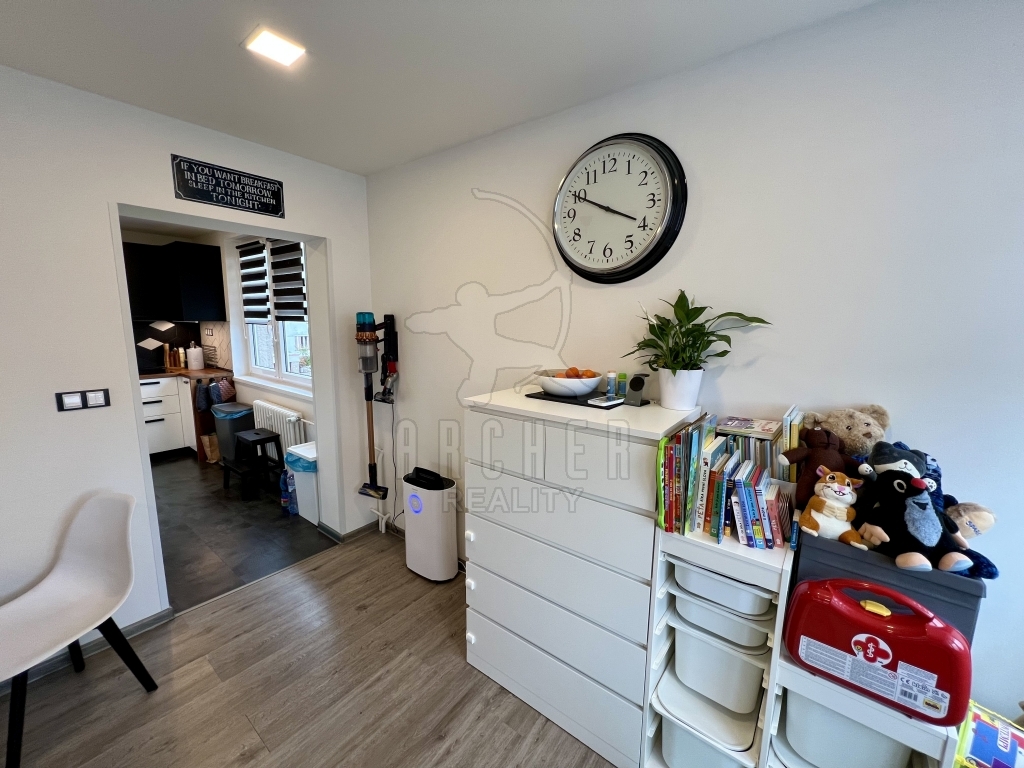 Pojďme se nechat uhranout tímto bytem v družstevním vlastnictví. Ze společných prostor vstupujeme do podlouhlé chodby, která slouží jako hlavní komunikační tepna všech místností. Zároveň zde nalezneme samostatnou walk-in šatnu. Po obou stranách chodby se nabízejí dva pokoje zhruba stejné velikosti, z nichž jeden je aktuálně využíván jako ložnice a druhý plní funkci pracovny. Opravdovou perlou bytu je velkorysý obývací pokoj s okny do všech stran. Na severní straně na něj organicky navazuje kuchyně s novou kuchyňskou linkou, vybavená veškerými moderními spotřebiči. Na jižní straně pak pokoj ústí do lodžie (4m2) s nádherným výhledem na Brdy. Pokoj je plně klimatizován, takže je zajištěn komfort i v kritických letních měsících. Byt disponuje ještě velikou koupelnou s vanou i sprchovým koutem a samostatnou toaletou.