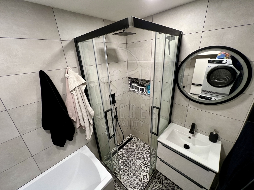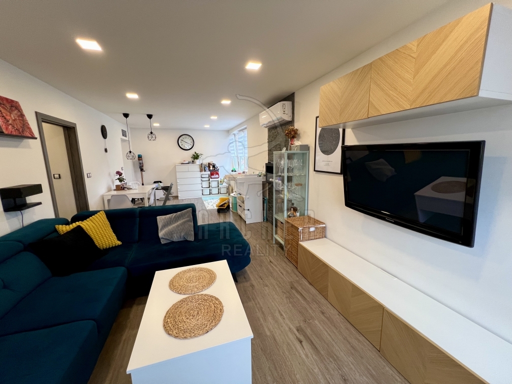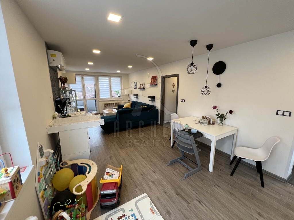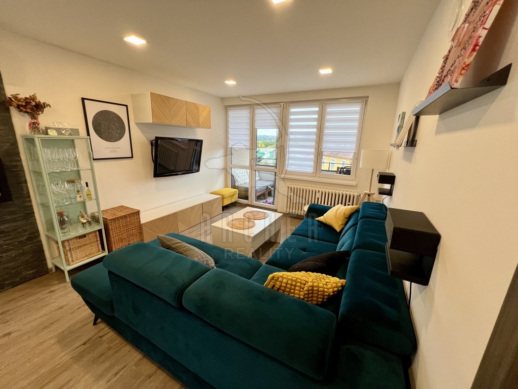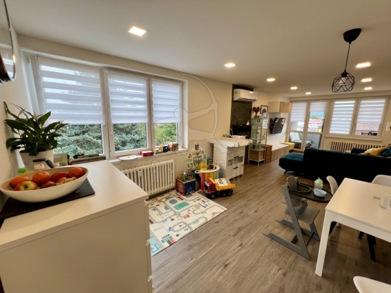 Pojďme se nechat uhranout tímto bytem v družstevním vlastnictví. Ze společných prostor vstupujeme do podlouhlé chodby, která slouží jako hlavní komunikační tepna všech místností. Zároveň zde nalezneme samostatnou walk-in šatnu. Po obou stranách chodby se nabízejí dva pokoje zhruba stejné velikosti, z nichž jeden je aktuálně využíván jako ložnice a druhý plní funkci pracovny. Opravdovou perlou bytu je velkorysý obývací pokoj s okny do všech stran. Na severní straně na něj organicky navazuje kuchyně s novou kuchyňskou linkou, vybavená veškerými moderními spotřebiči. Na jižní straně pak pokoj ústí do lodžie (4m2) s nádherným výhledem na Brdy. Pokoj je plně klimatizován, takže je zajištěn komfort i v kritických letních měsících. Byt disponuje ještě velikou koupelnou s vanou i sprchovým koutem a samostatnou toaletou.