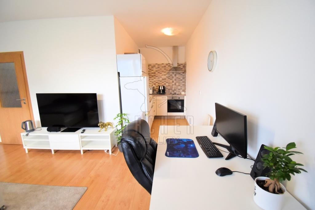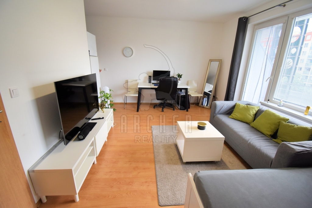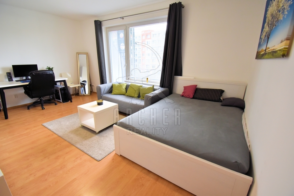 Byt sestává ze vstupní chodby, prostorného obývacího pokoje s kuchyňskou částí a vstupem na balkon, koupelny se sprchovým koutem a WC.