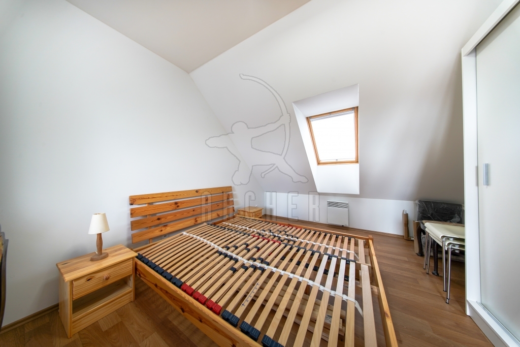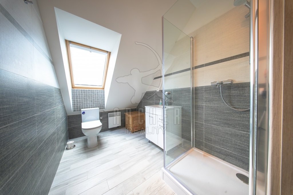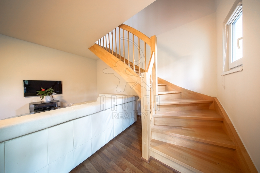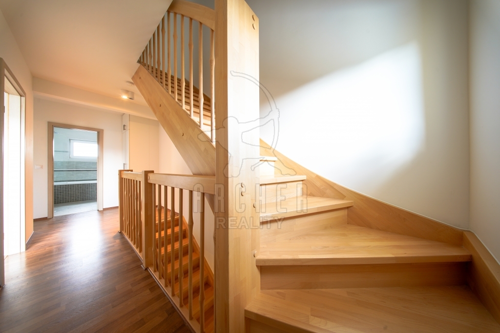 V prvním patře jsou dvě ložnice a velká koupelna s vanou, WC a dvěma umyvadly, aby rána probíhala v pohodě a komfortu. Praktická je vestavěná skříň na chodbě, která využívá volné místo. Ve druhém patře je pak poslední z ložnic, která slouží i jako obývací pokoj. I v tomto patře je koupelna se sprchovým koutem a WC. Vše završuje prostorná půda, která slouží pro odkládání věcí. Dům je tak velmi příjemný k bydlení a vše podtrhuje klimatizace dostupná v prvním a posledním nadzemním podlaží.