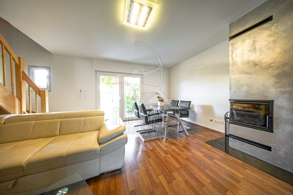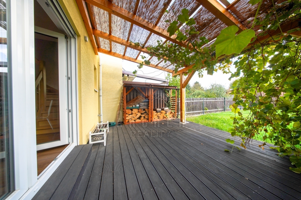 Přízemí domu tvoří obývací pokoj s krbem a velká kuchyně s veškerým vybavením vč. myčky, indukční desky a vinotéky. Z obývacího pokoje se francouzským oknem dostanete na terasu krytou pergolou a na zahradu se zahradním domkem na opačném konci. Z předsíně se dostanete na WC s bidetem a vedle dveří je praktická komora.