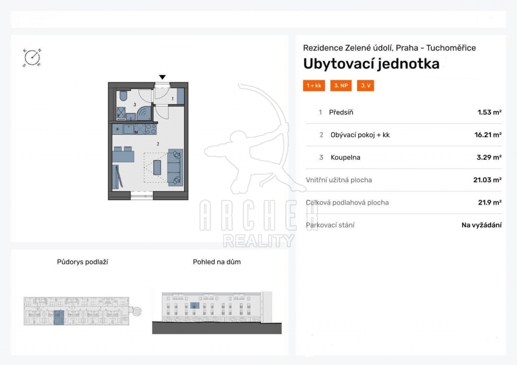 Nabízíme k prodeji moderně řešenou ubytovací jednotku s dispozicí 1+kk, celkem 22 m2, v osobním vlastnictví, Tuchoměřice (okres Praha - západ), ul. V Kněžívce.