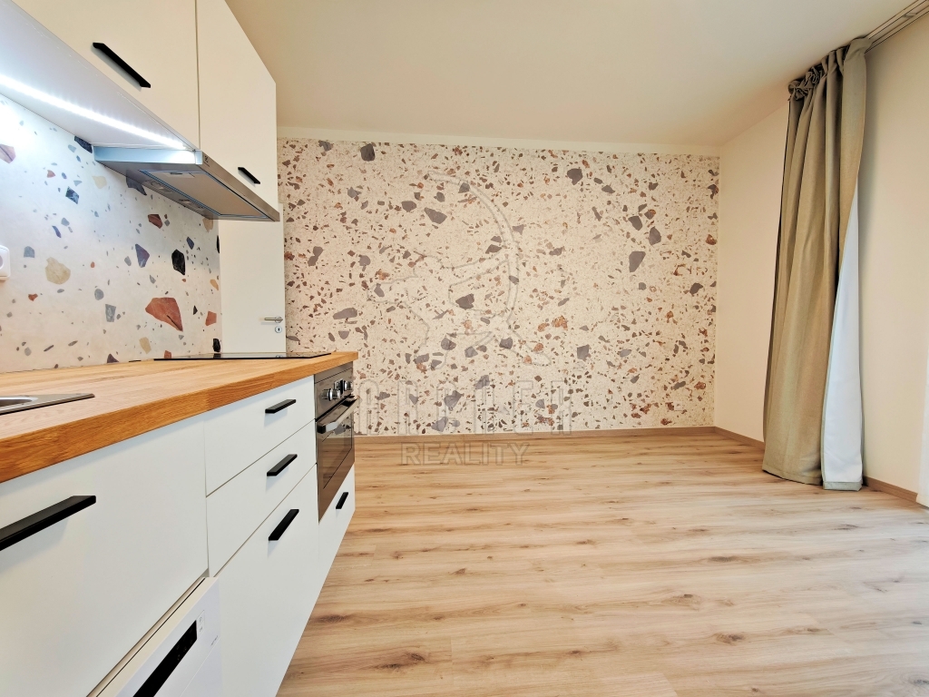 útulný obývací pokoj s plně vybavenou kuchyňskou linkou (sklokeramická varná deska, elektrická trouba s mikrovlnnou funkcí, digestoř, myčka, vestavěná lednice s mrazákem),