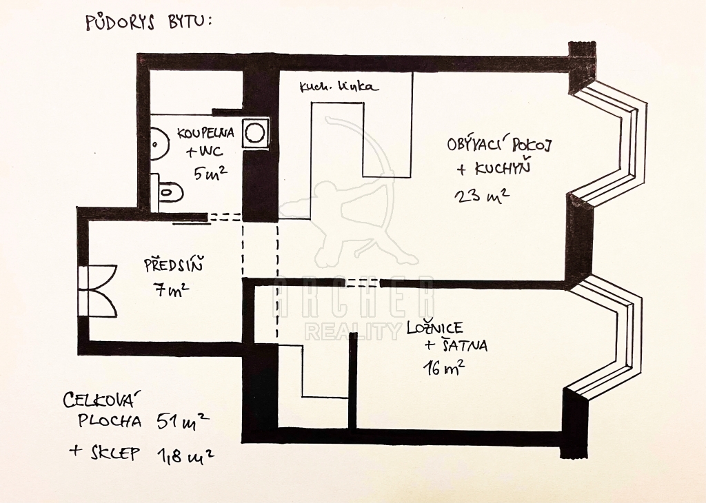| Popis vybavení bytu | Kuchyňská linka s vestavěnými spotřebiči: horkovzdušnou troubou, plynovou varnou deskou, lednicí a mrazákem. Vestavěná skříň v šatně u ložnice. |