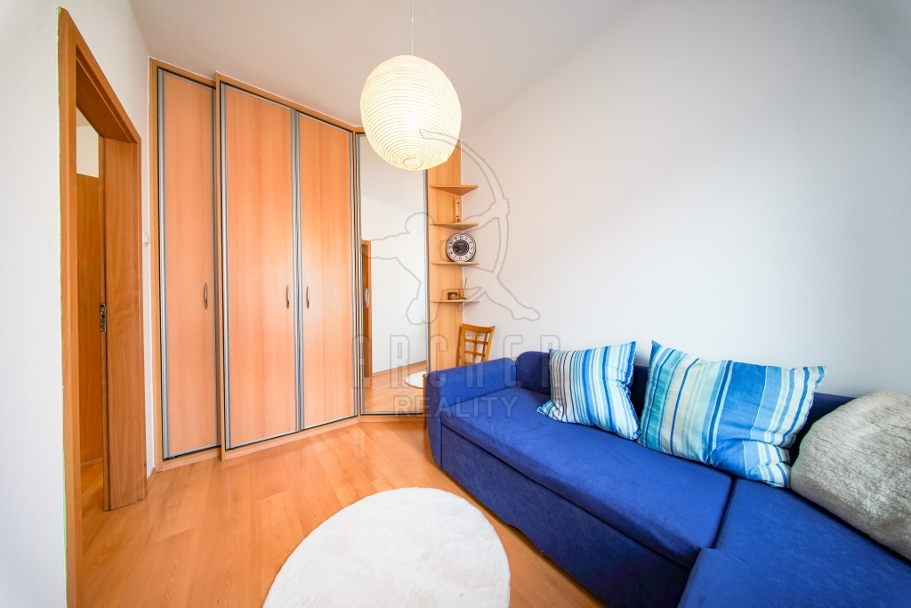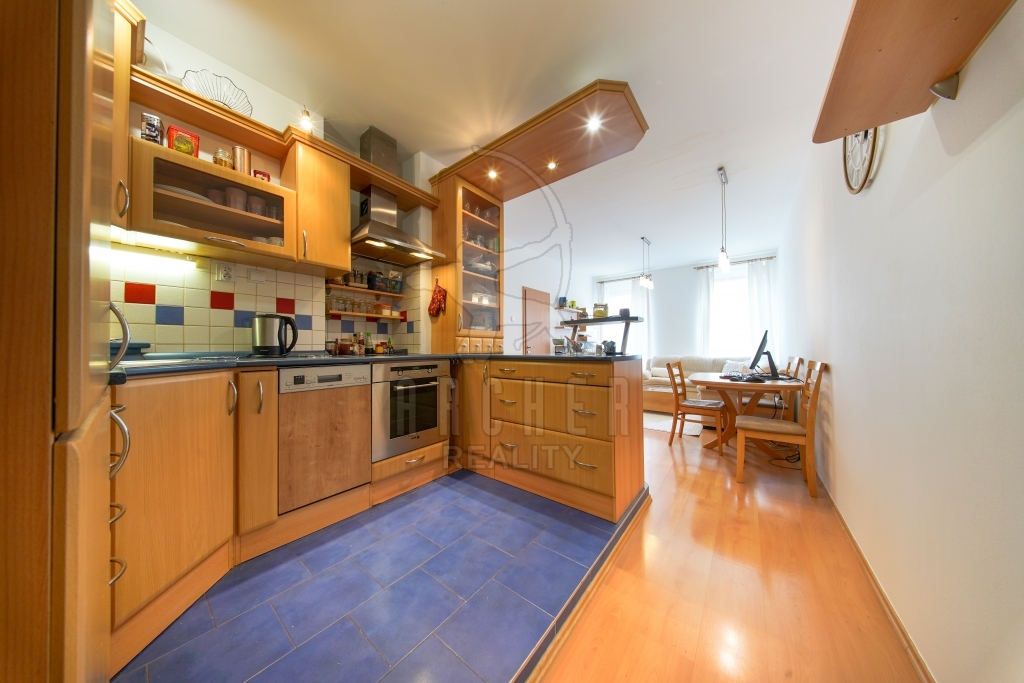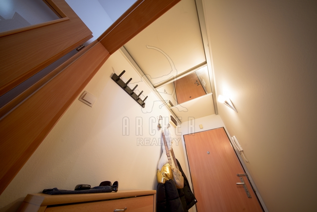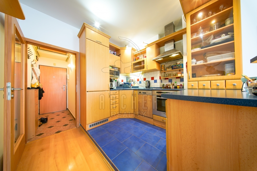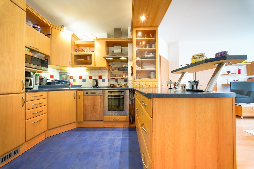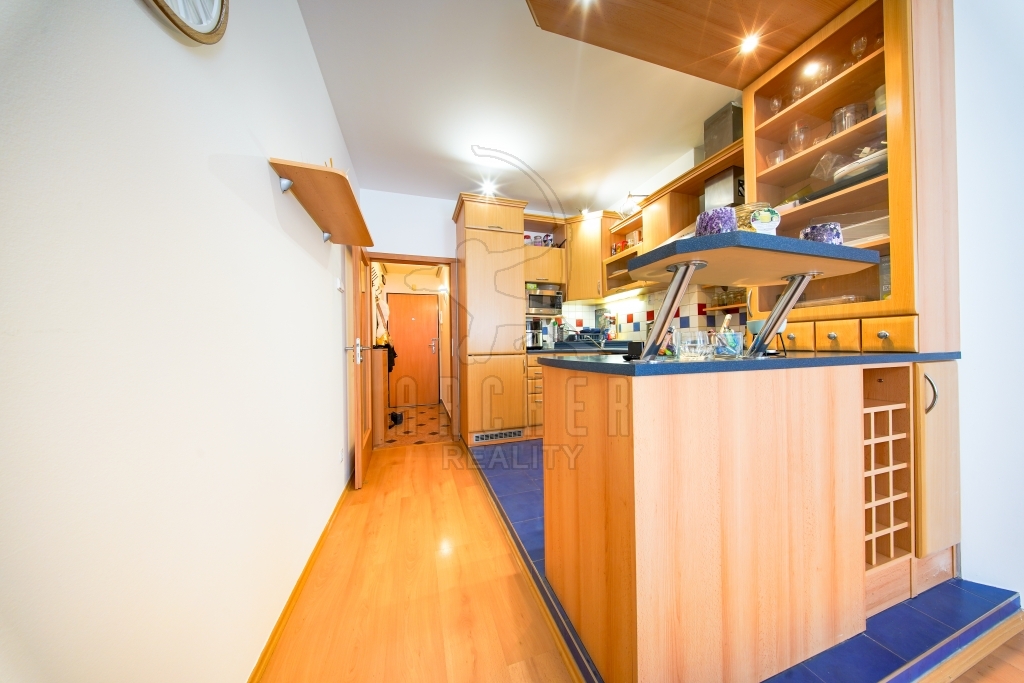 Již v předsíni zaujme příchozího \\\"skříň\\\" na stropě. Dokonalé využití 2,7 m vysokých stropů pro získání úložného prostoru, že? Kuchyňský kout u obývacího pokoje je prakticky řešen a vyrobený na míru. Nabízí všechny přístroje, které potřebujete, včetně myčky a je otevřený směrem k obytnému prostoru, od kterého jej odděluje barový pult, aby vařící člen domácnosti mohl komunikovat s tím, kdo je v obývacím pokoji. Ložnice je vybavena na míru šitou vestavěnou skříní a nabízí tak spoustu úložného prostoru. Okna jsou vybavena jak vnějšími, tak vnitřními žaluziemi, můžete tak plně řídit osvětlení své domácnosti. Koupelna s rohovou vanou, sprchovým koutem a WC má i prostor na pračku.
