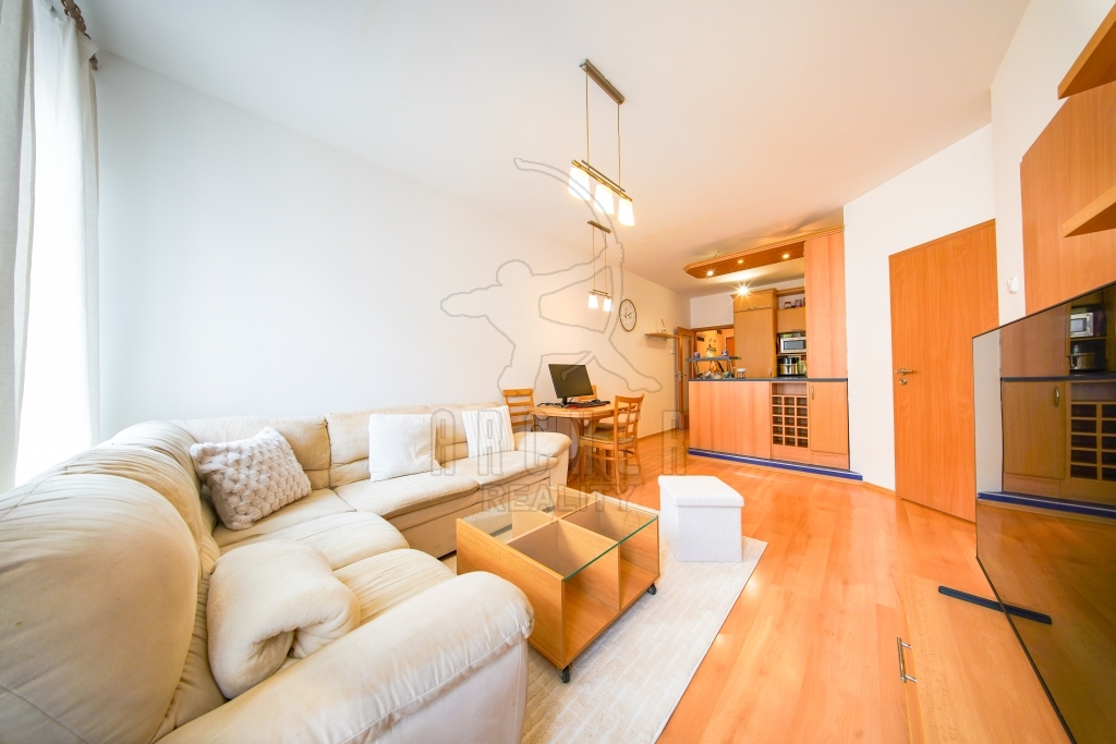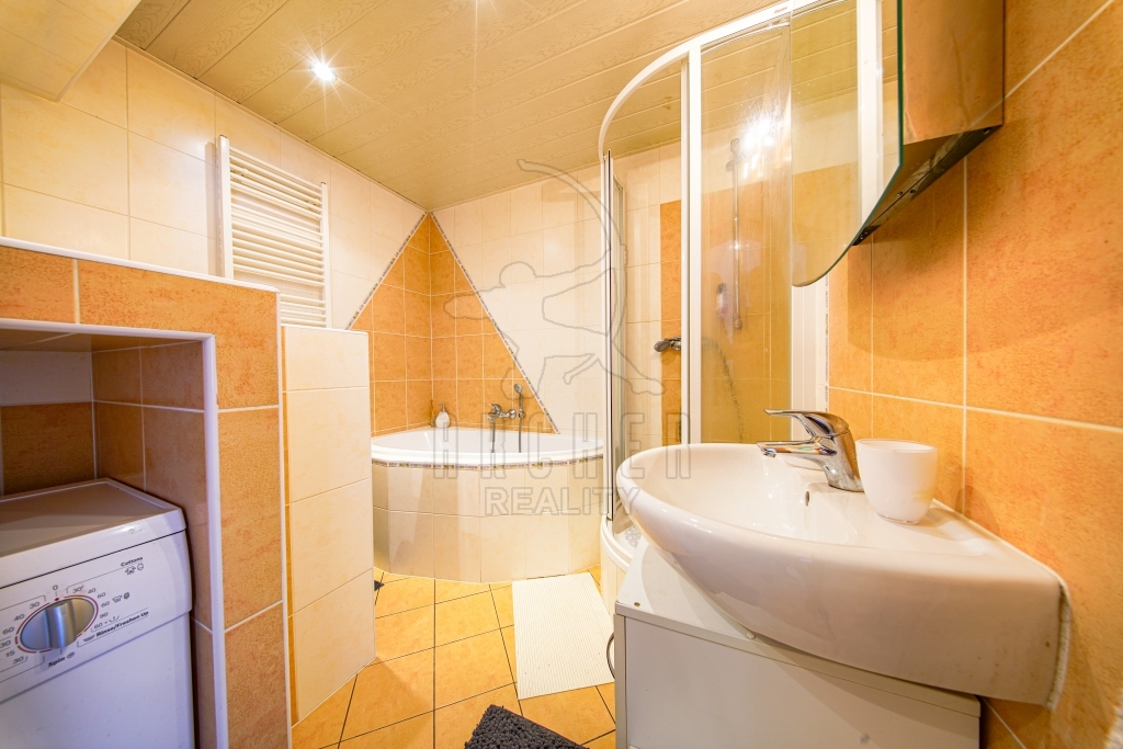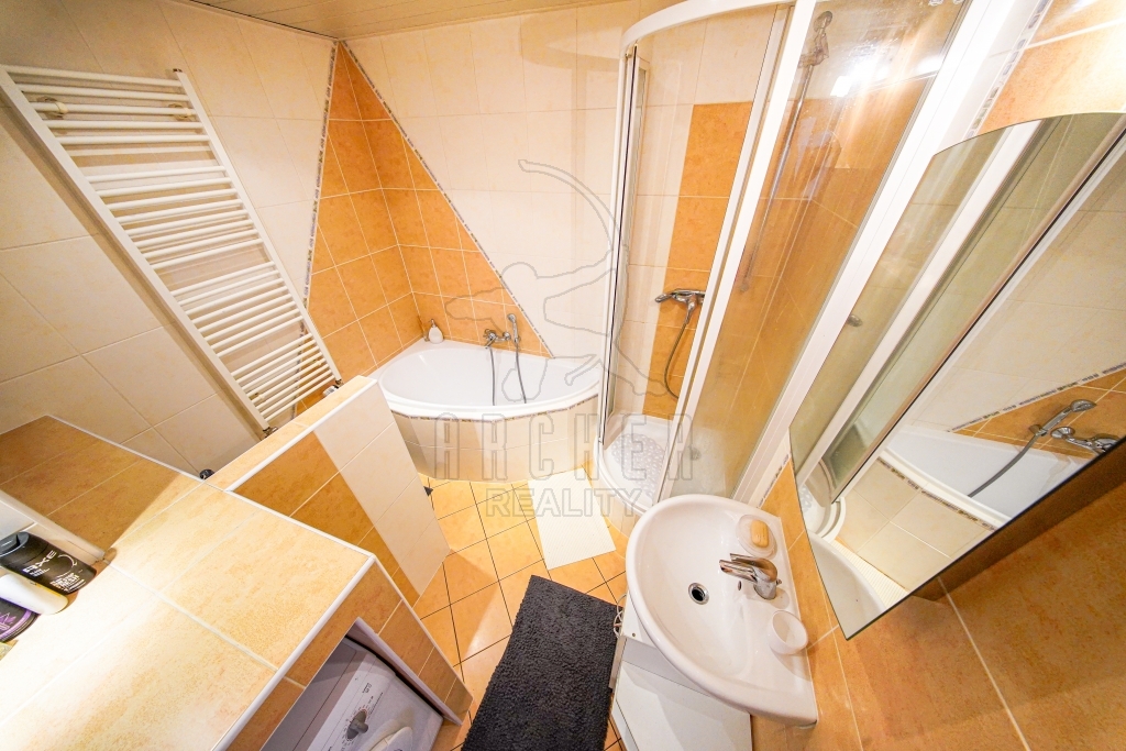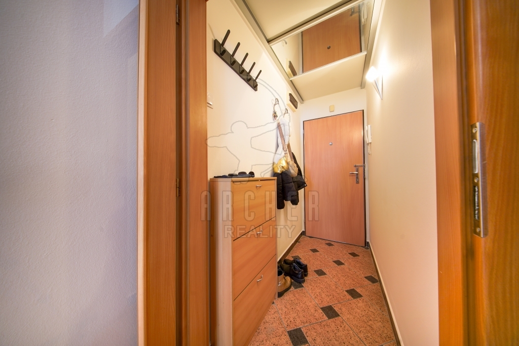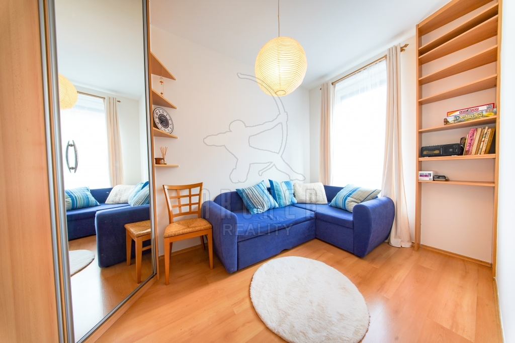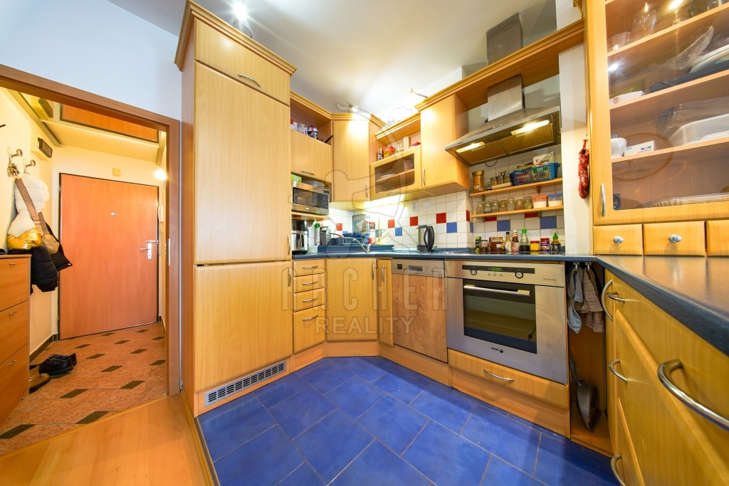 Již v předsíni zaujme příchozího \\\"skříň\\\" na stropě. Dokonalé využití 2,7 m vysokých stropů pro získání úložného prostoru, že? Kuchyňský kout u obývacího pokoje je prakticky řešen a vyrobený na míru. Nabízí všechny přístroje, které potřebujete, včetně myčky a je otevřený směrem k obytnému prostoru, od kterého jej odděluje barový pult, aby vařící člen domácnosti mohl komunikovat s tím, kdo je v obývacím pokoji. Ložnice je vybavena na míru šitou vestavěnou skříní a nabízí tak spoustu úložného prostoru. Okna jsou vybavena jak vnějšími, tak vnitřními žaluziemi, můžete tak plně řídit osvětlení své domácnosti. Koupelna s rohovou vanou, sprchovým koutem a WC má i prostor na pračku.