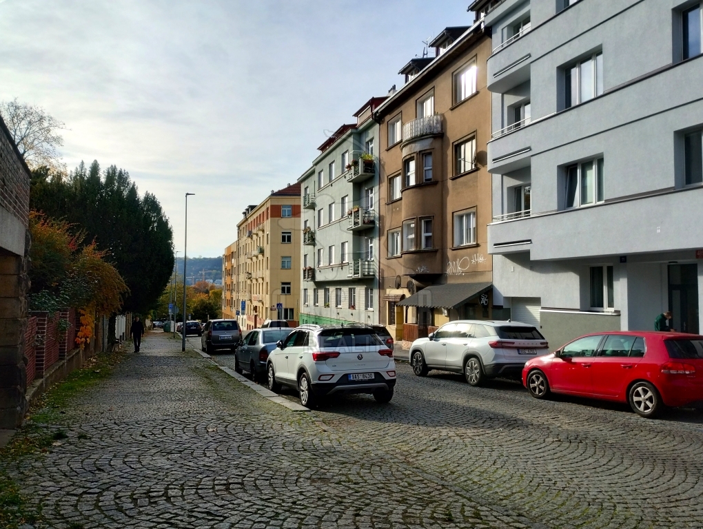 Moderní rekonstruovaný byt se nachází v klidné části Podolí. Pokoje s vysokými stropy, novými parketami a vysokými okny jsou honosné. Obývací pokoj má precizní kuchyňskou linku z masivu s kvalitními spotřebiči Bosch a kováním Bloom, vyrobenou na míru. Ložnice naproti přes velkou předsíň je orientována na klidný severozápad. V ložnici a v předsíni jsou vestavěné skříně na zakázku. Koupelna má vanu, umyvadlo a proniká do ní sluneční světlo luxferami. Toaleta je samostatná, také s umyvadlem. Vytápění je zajištěno úsporným plynovým kondenzačním kotlem Buderus, v koupelně je podlahové. V předsíni je praktická skladovací komora - prádelna s prostorem pro pračku a sušičku. Na patře je společný balkon k užívání.