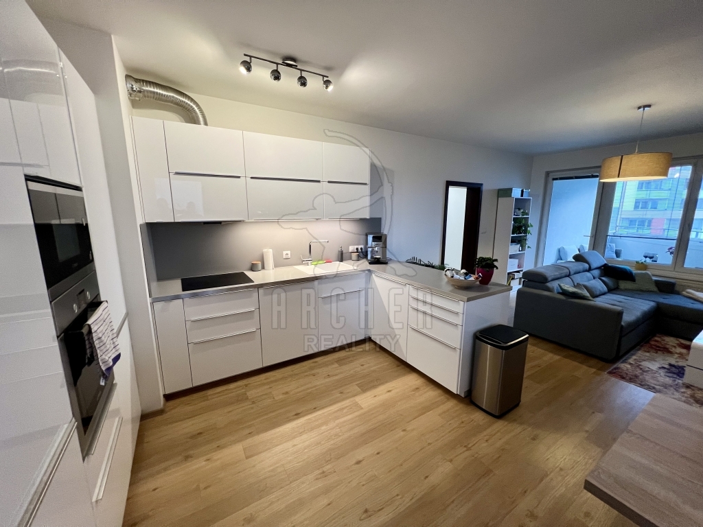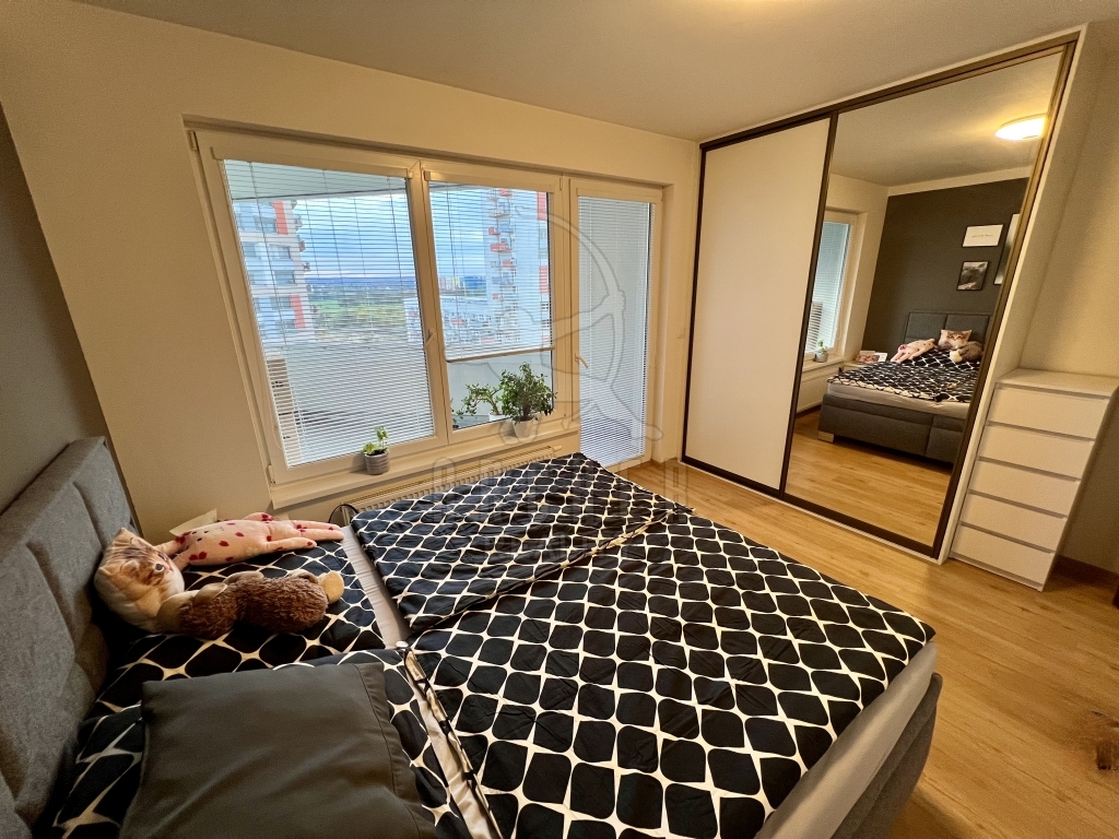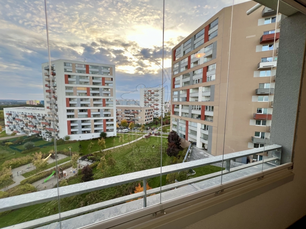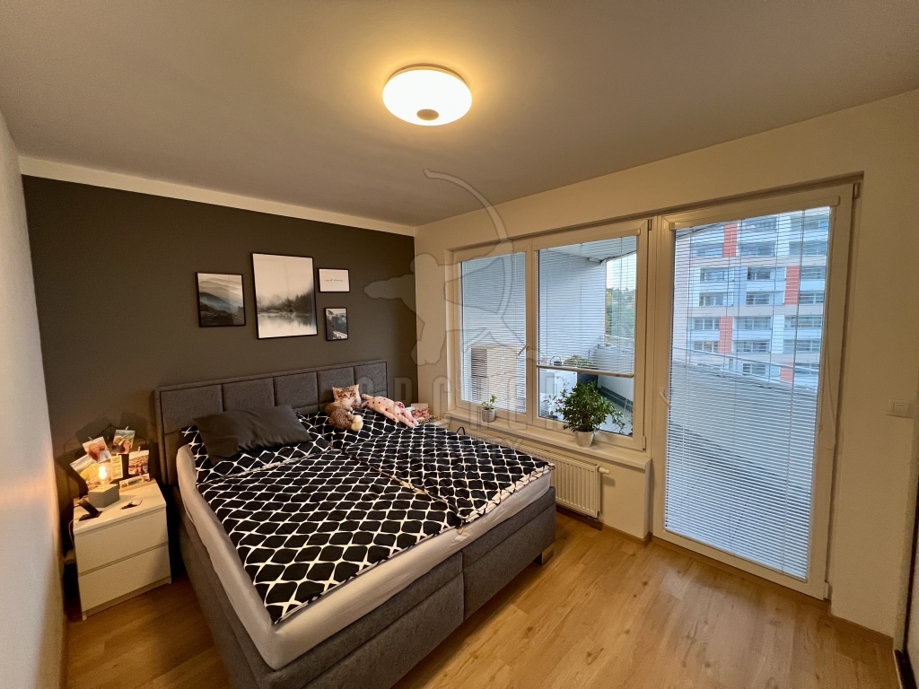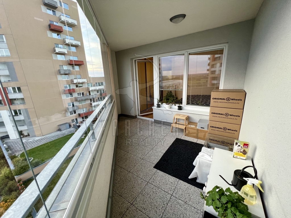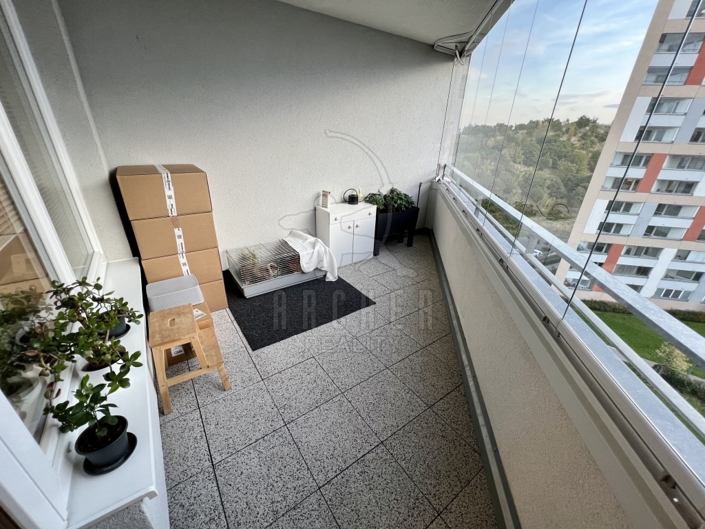 Ze společných prostor vstupujeme do chodby halového typu s dostatkem místa pro vestavěné skříně. Na jejím konci nalezneme vskutku velkorysý obytný prostor (32m2) v jižní orientaci s dalším oknem u pracovního místa na západ. To dodává celé místnosti mimořádně vzdušný a světlý charakter. Ta je organicky rozdělena mezi kuchyňskou a obývací část. Kuchyňská linka do tvaru L je vybavena kvalitními spotřebiči, přes jídelnu se dostáváme k pohodlí rozložité pohovky, za níž už nalezneme první prosklenou lodžii pojatou jako exteriérový obývák. Menší místnost je pojata jako útulná ložnice se vstupem na další lodžii, toho času obývanou domácím mazlíčkem. V srdci bytu nalezneme ještě prostornou koupelnu s vanou a toaletou a samostatnou komoru, plnící funkci šatny. Díky zaskleným lodžiím lze po většinu roku využít k bydlení celých 83m2 plochy.