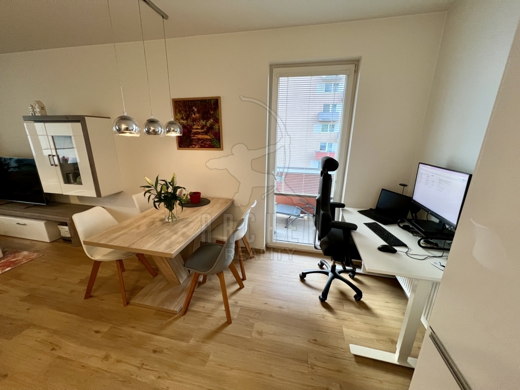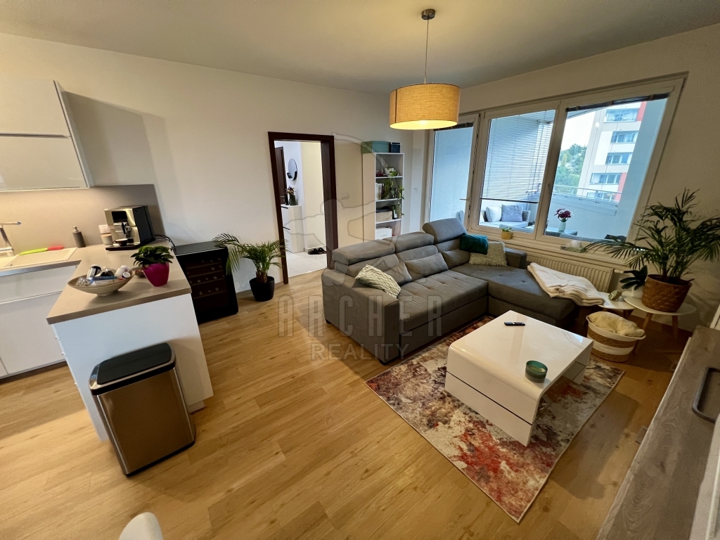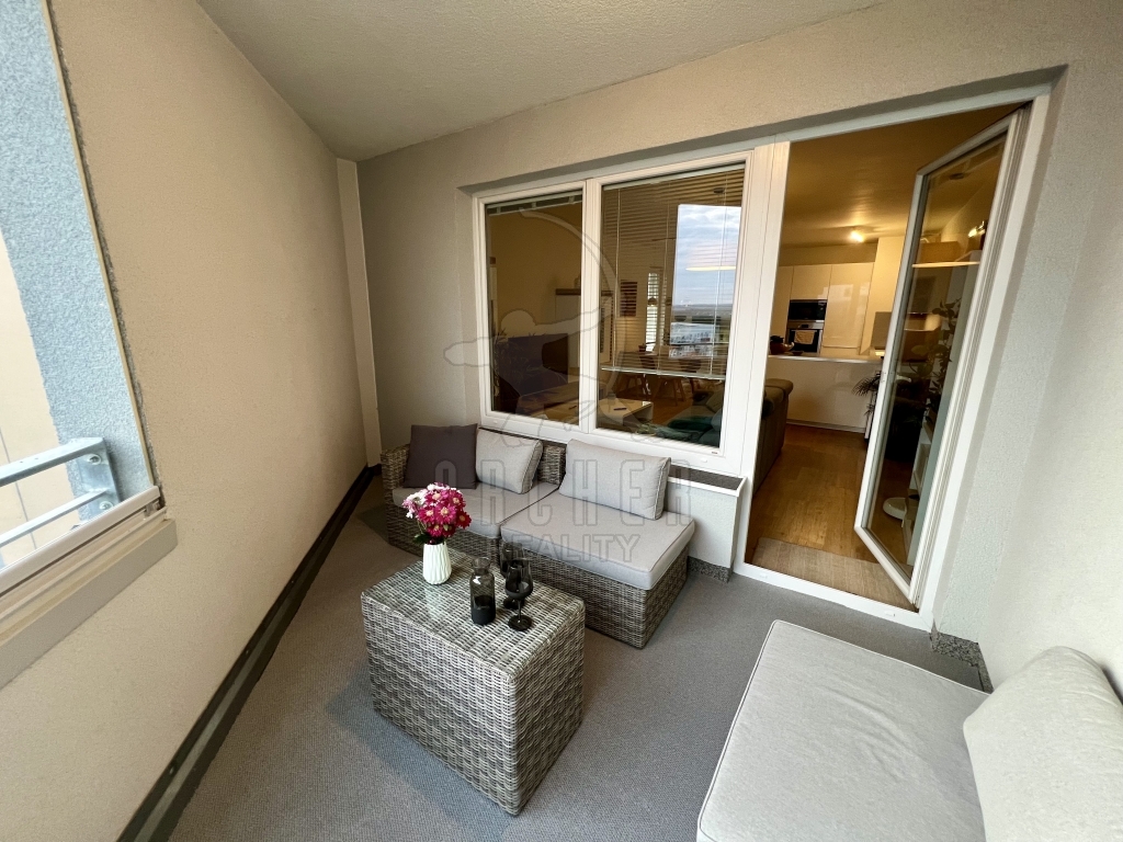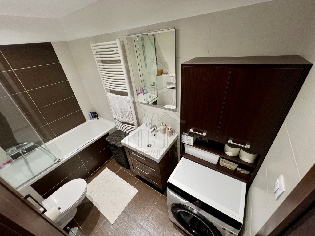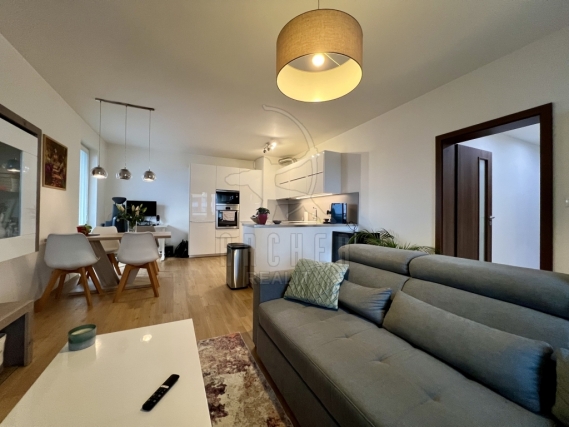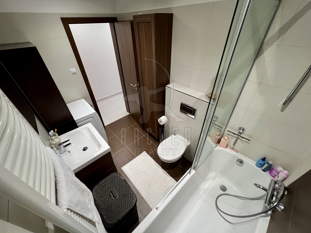 Ze společných prostor vstupujeme do chodby halového typu s dostatkem místa pro vestavěné skříně. Na jejím konci nalezneme vskutku velkorysý obytný prostor (32m2) v jižní orientaci s dalším oknem u pracovního místa na západ. To dodává celé místnosti mimořádně vzdušný a světlý charakter. Ta je organicky rozdělena mezi kuchyňskou a obývací část. Kuchyňská linka do tvaru L je vybavena kvalitními spotřebiči, přes jídelnu se dostáváme k pohodlí rozložité pohovky, za níž už nalezneme první prosklenou lodžii pojatou jako exteriérový obývák. Menší místnost je pojata jako útulná ložnice se vstupem na další lodžii, toho času obývanou domácím mazlíčkem. V srdci bytu nalezneme ještě prostornou koupelnu s vanou a toaletou a samostatnou komoru, plnící funkci šatny. Díky zaskleným lodžiím lze po většinu roku využít k bydlení celých 83m2 plochy.