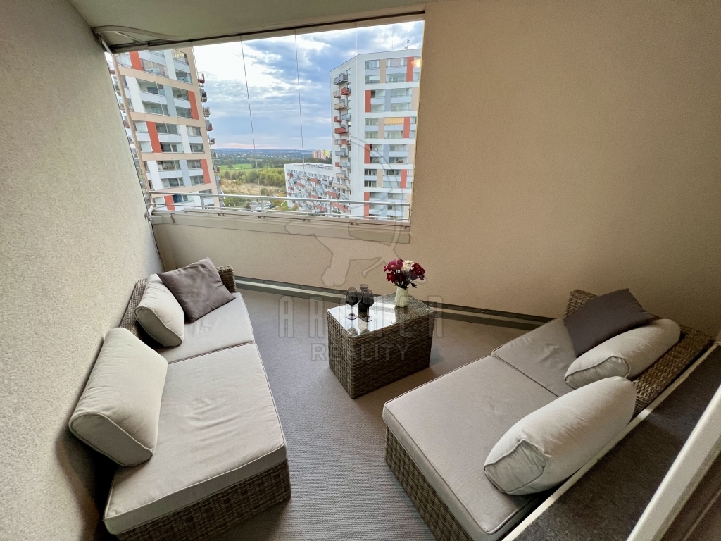 Vysoce inspirativní byt se nachází v pátém patře designového bytového domu projektu Javorová Čtvrť z roku 2015. Daleký výhled do luk a polí hned ze dvou lodžií a balkonu vytváří pocit výjimečného, téměř meditativního domova. Pojďme se po něm projít.