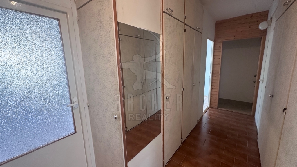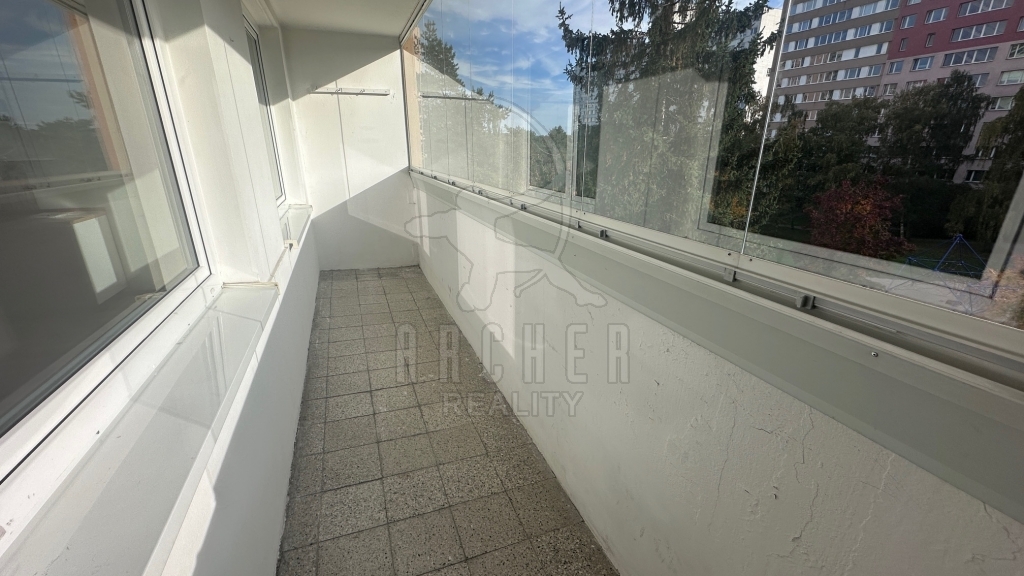 Dispozice bytu zahrnuje dva neprůchozí pokoje, prostorný obývací pokoj, kuchyň, koupelnu s vanou a samostatné WC. V předsíni jsou vestavěné skříně, nabízející dostatek úložného prostoru. Na podlahách je lino, které je praktické na údržbu. K bytu náleží prostorná zasklená lodžie, ideální pro odpočinek a dále komora, umístěná na stejném patře.
