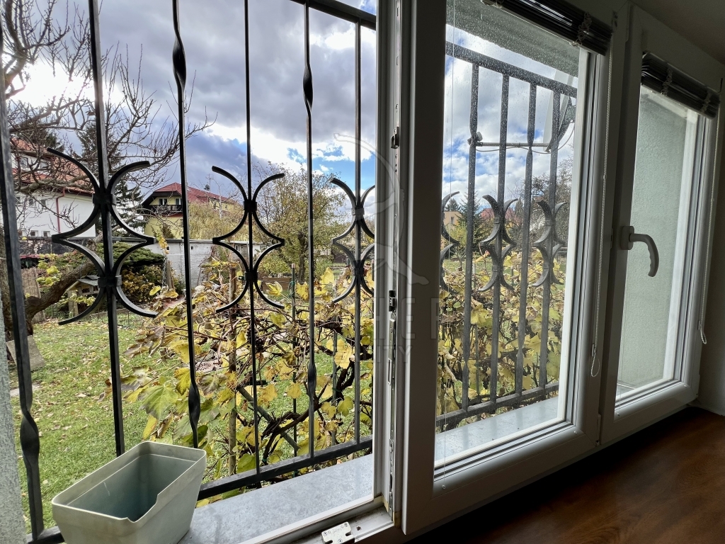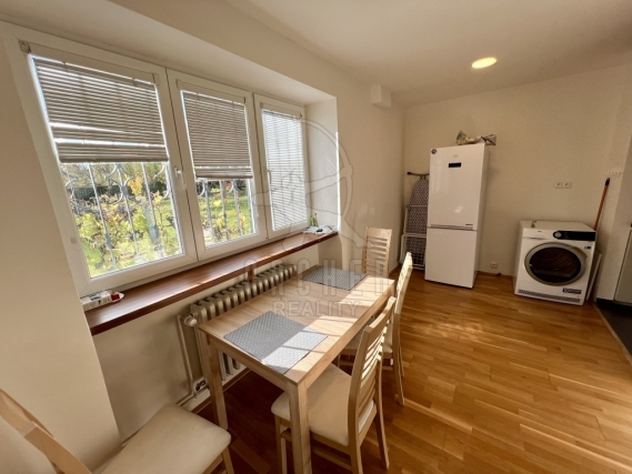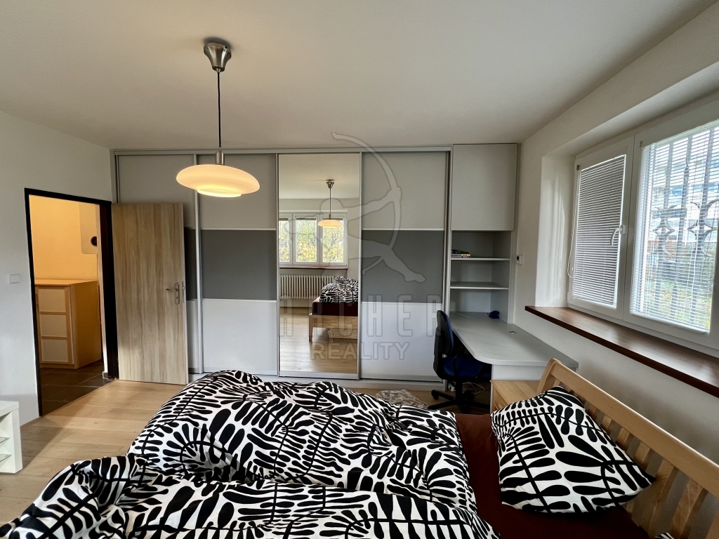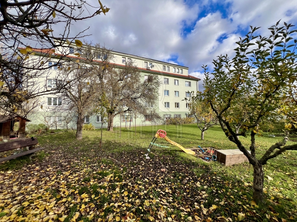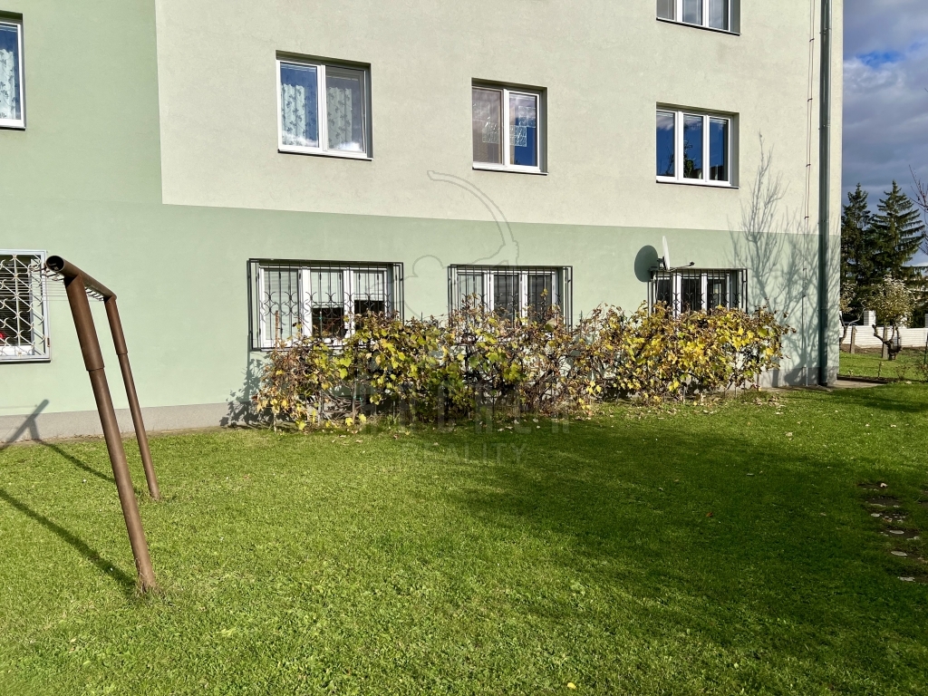 Velmi příjemný byt s podílem na ohromné zahradě se nachází na prvním podlaží cihlového bytového domu ze sedmdesátých let. Byt se nachází na úrovni terénu a má plně bezbariérový příchod. Ze společných prostor vstupujeme do podlouhlé chodby, která slouží jako hlavní komunikační tepna, zároveň nabízí příjemné zádveří. Na jihozápadní straně bytu nalezneme dva na sebe navazující pokoje, z nichž první slouží jako obývací prostora a druhý především jako jídelna. Z té se otevírá kuchyňský kout do praktického tvaru U, vybavený všemi moderními spotřebiči. Z oken je nádherný výhled do rozlehlé zahrady skrze soukromý vinohrad. Velkorysá ložnice v jihovýchodní orientaci je šikovně oddělena od zbytku bytu chodbou s dostatkem místa pro úložné prostory, kde také nalezneme plynový kotel. Ložnice je doslova zalita světlem, nabízí klid v opět krásné výhledy do zeleně. Celou jednu stěnu zabírají vestavěné skříně. Byt prošel v posledních pěti letech postupně precizní a náročnou rekonstrukcí - elektřina je v mědi, rozvody v plastu, stropní izolace a snížené podhledy dodávají bytu dojem novostavby. K bytu náleží sklep (2m2).
