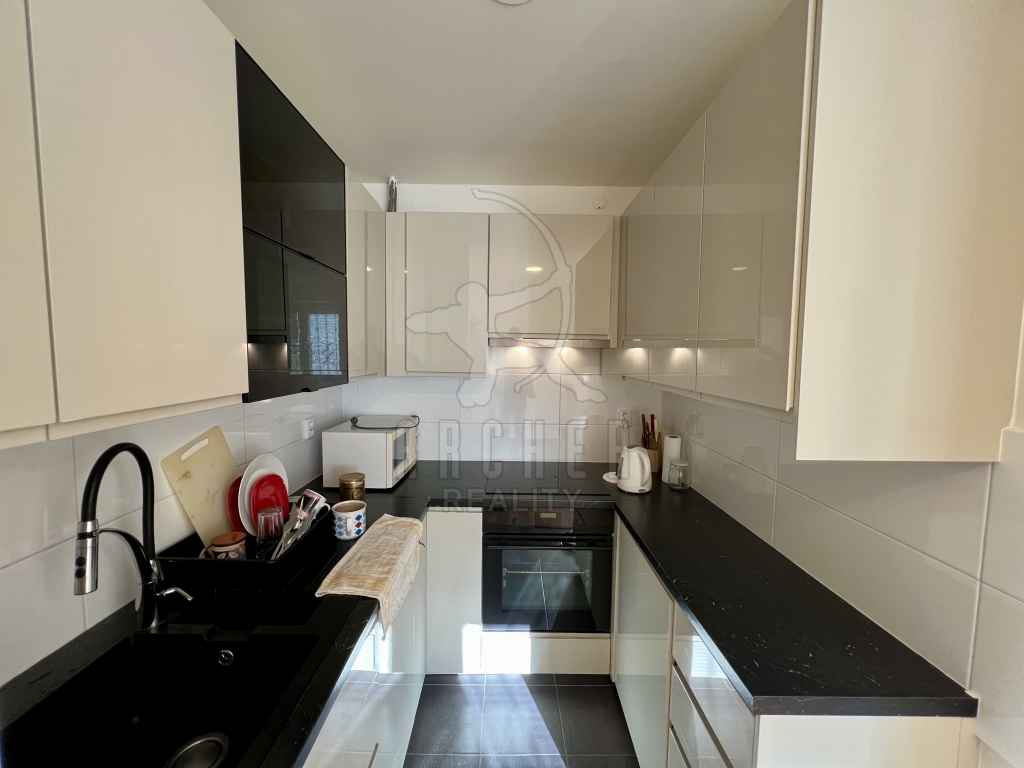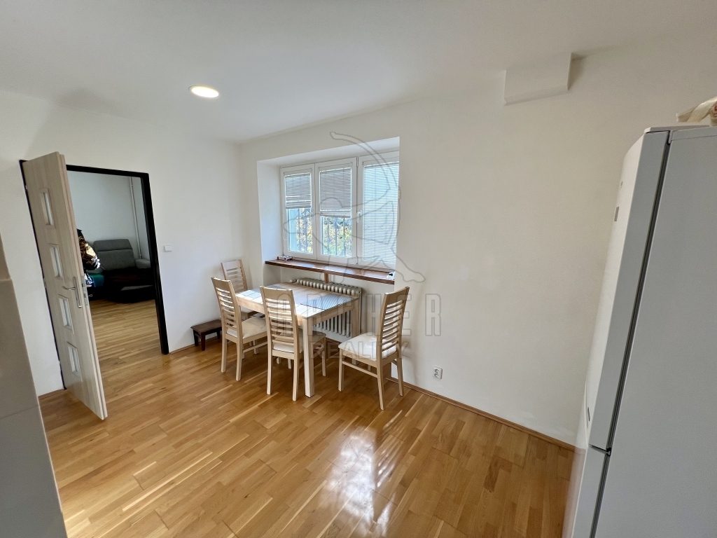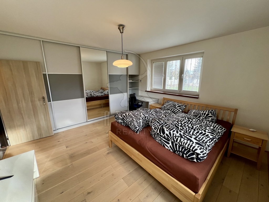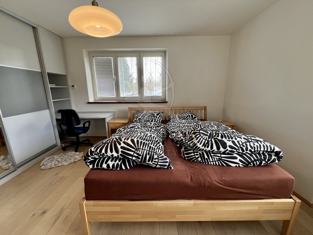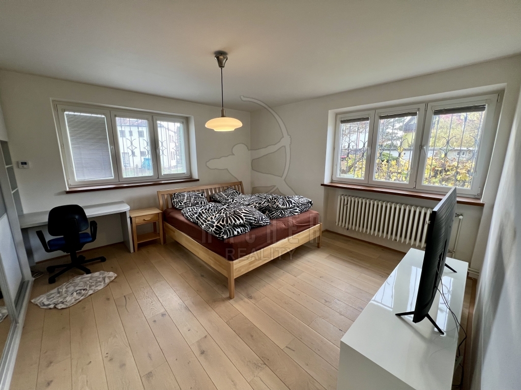 Velmi příjemný byt s podílem na ohromné zahradě se nachází na prvním podlaží cihlového bytového domu ze sedmdesátých let. Byt se nachází na úrovni terénu a má plně bezbariérový příchod. Ze společných prostor vstupujeme do podlouhlé chodby, která slouží jako hlavní komunikační tepna, zároveň nabízí příjemné zádveří. Na jihozápadní straně bytu nalezneme dva na sebe navazující pokoje, z nichž první slouží jako obývací prostora a druhý především jako jídelna. Z té se otevírá kuchyňský kout do praktického tvaru U, vybavený všemi moderními spotřebiči. Z oken je nádherný výhled do rozlehlé zahrady skrze soukromý vinohrad. Velkorysá ložnice v jihovýchodní orientaci je šikovně oddělena od zbytku bytu chodbou s dostatkem místa pro úložné prostory, kde také nalezneme plynový kotel. Ložnice je doslova zalita světlem, nabízí klid v opět krásné výhledy do zeleně. Celou jednu stěnu zabírají vestavěné skříně. Byt prošel v posledních pěti letech postupně precizní a náročnou rekonstrukcí - elektřina je v mědi, rozvody v plastu, stropní izolace a snížené podhledy dodávají bytu dojem novostavby. K bytu náleží sklep (2m2).