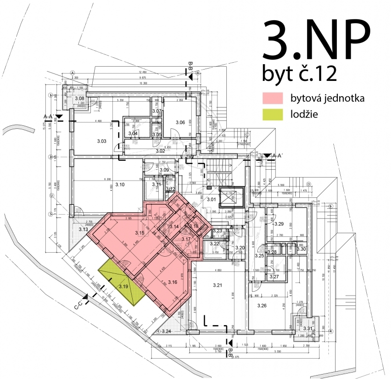 Byt č.12 se nachází v 3.NP, v ceně je zahrnuta lodžie, sklep a vnitřní parkovací místo.