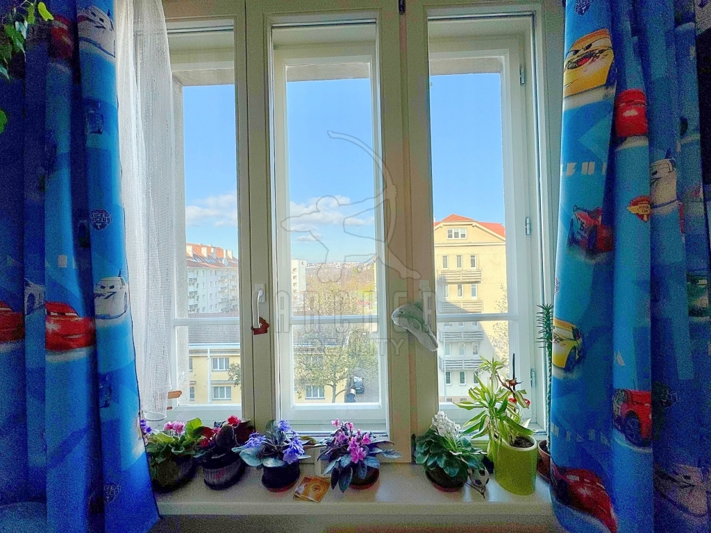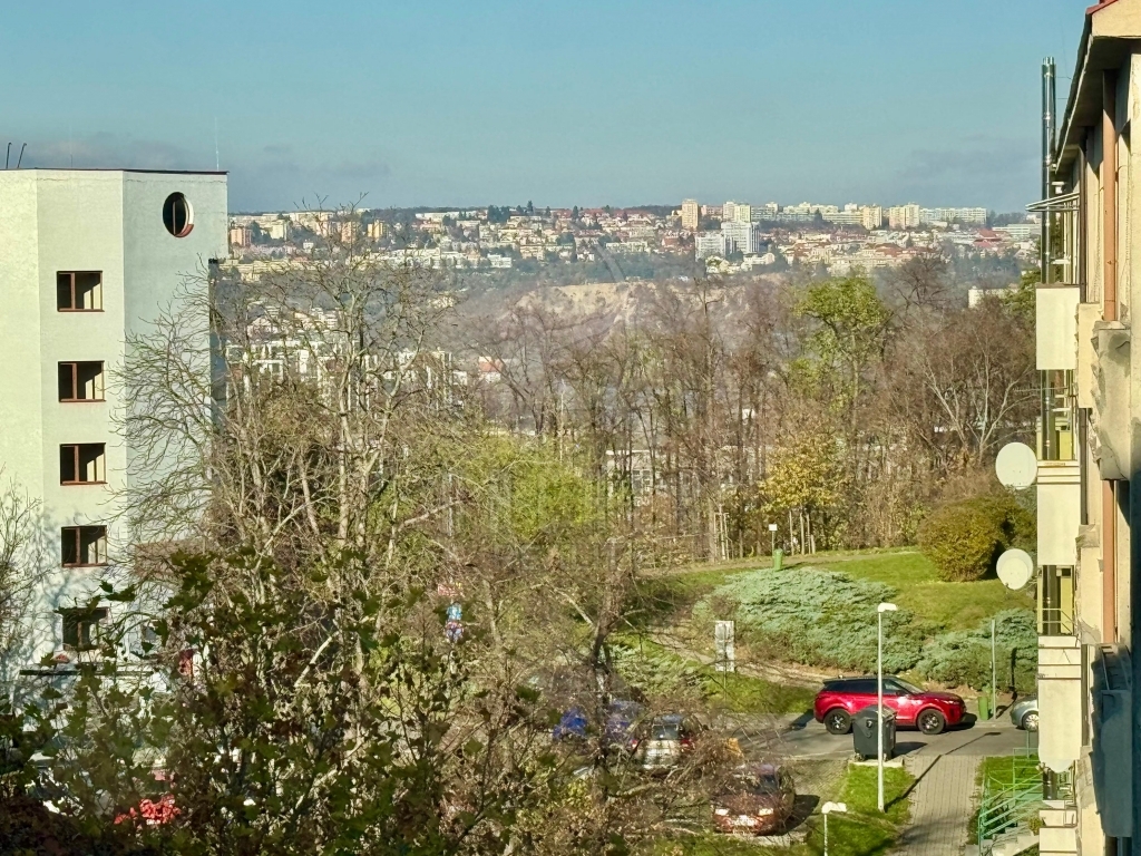 Byt byl kolaudován jako 1+1, ale oddělením části kuchyně u okna vznikla menší ložnice 4,5m2 oddělená příčkou a posuvnými dveřmi. Proto má nyní byt funkčně dispozici 2+kk. Z ložnice je průhled mezi domy přes park Pražačku nad zákrut Vltavy a na protější svah Troji a okolí.