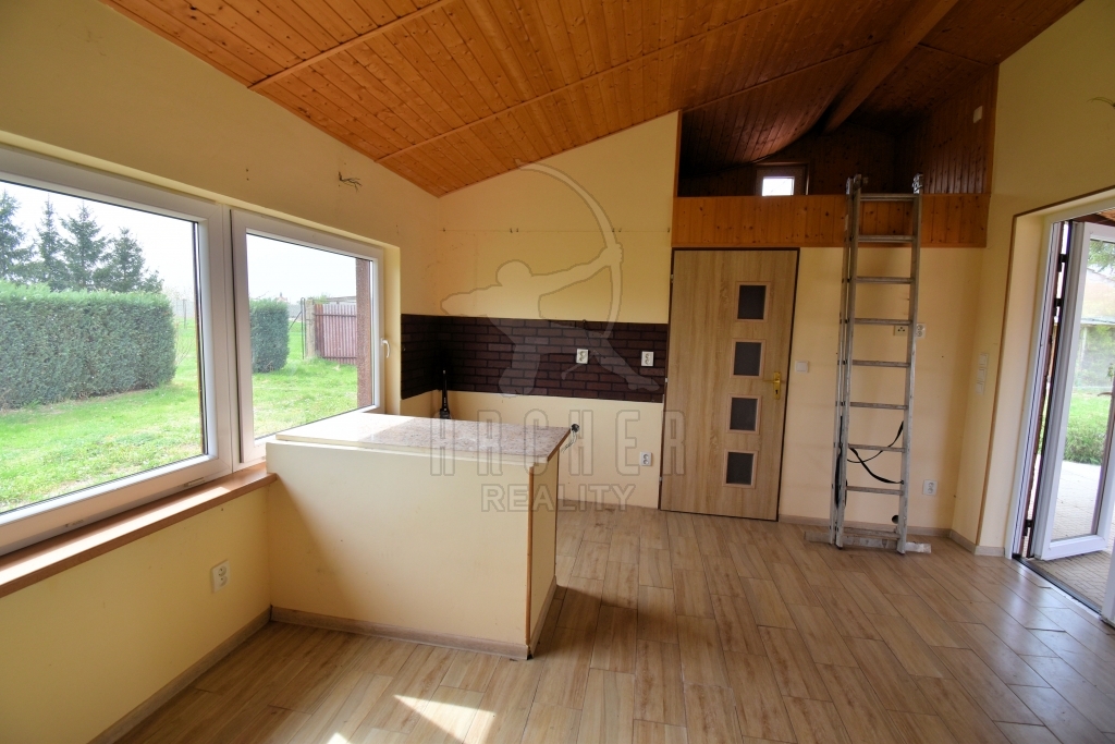 Druhý domek je slunná novostavba o dispozici 1+kk. Nabízí obývací prostor s přípravou na kuchyňskou linku, patro na spaní, koupelnu se sprchovým koutem a samostatné WC. Z obytného prostoru vstup na příjemnou, zastřešenou terasu.