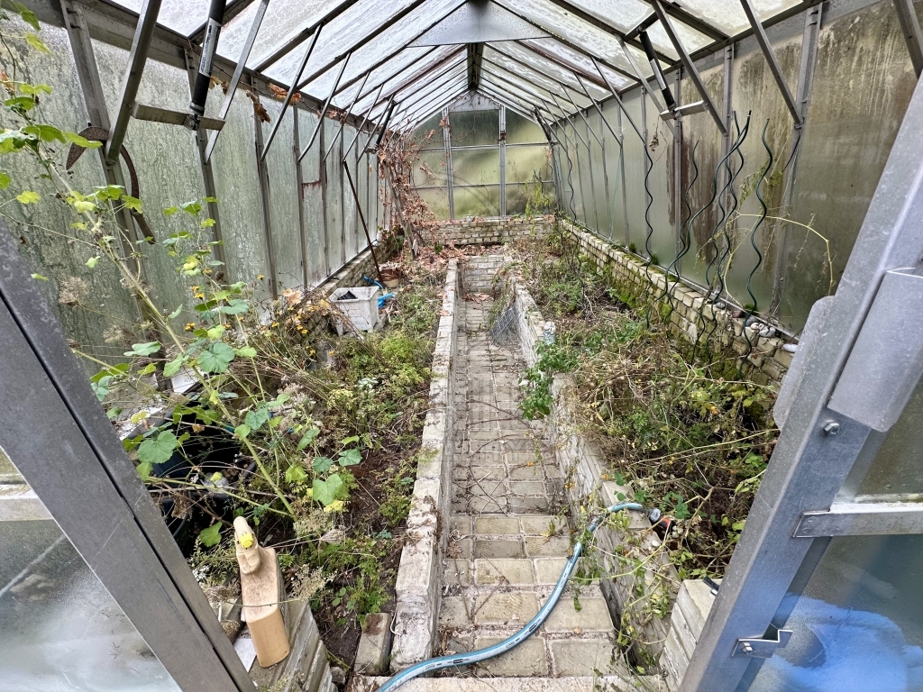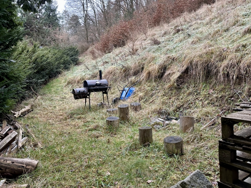 Zahrada, skleník, posezení u ohně, zvuky jak vítr hýbe větvemi.