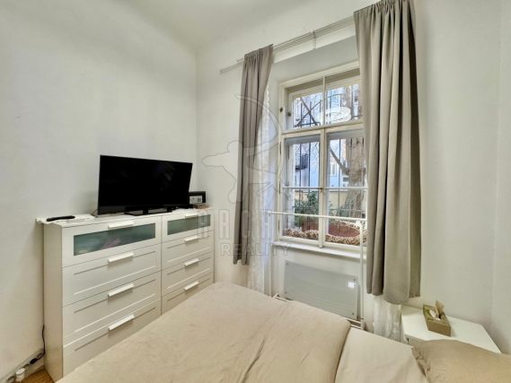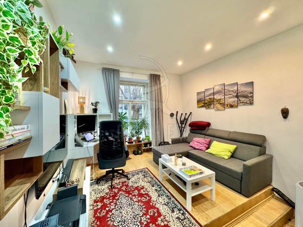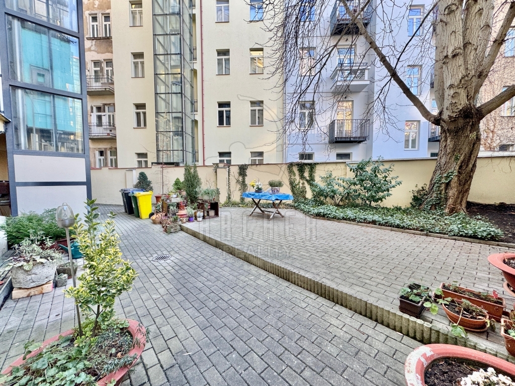 Byt má velmi vysoké stropy, proto je nad kuchyní a koupelnou spací patro, které přidává k 50m2 bytu prostor navíc. Pokoje jsou prosvětleny špaletovými okny z jihozápadního směru a směřují do elegantního dlážděného dvora, který je zdoben a aranžován obyvateli domu. Je to prostor pro posezení se sousedy či přáteli a pro relaxaci.