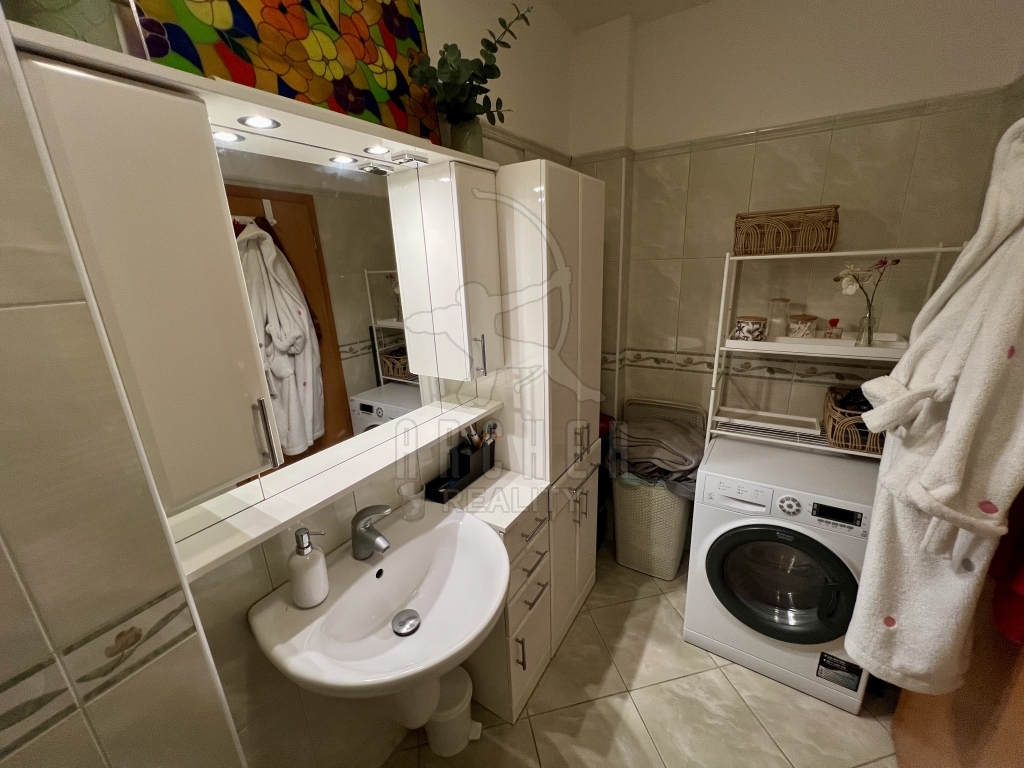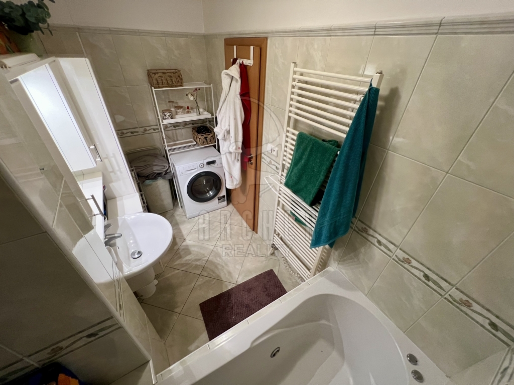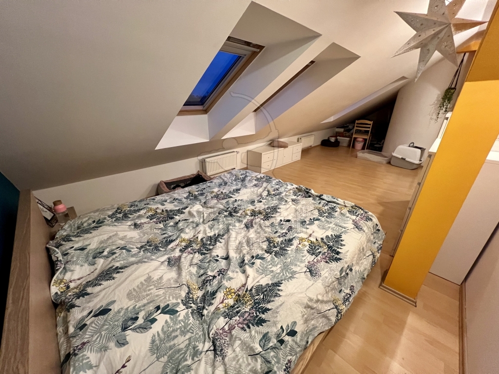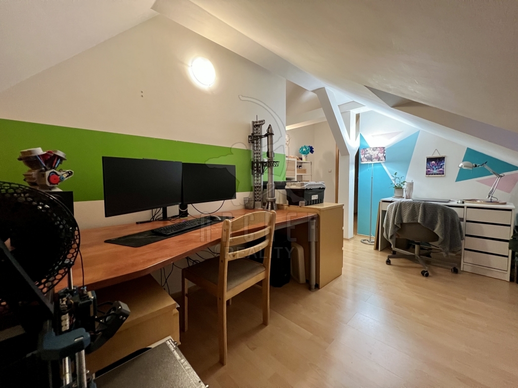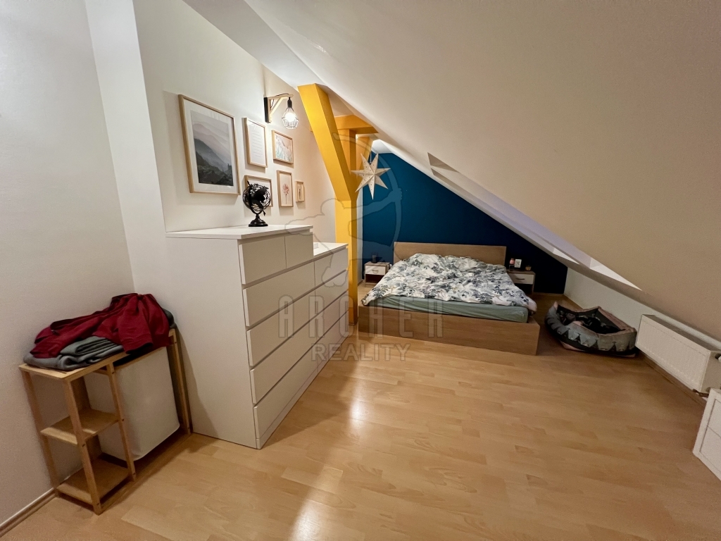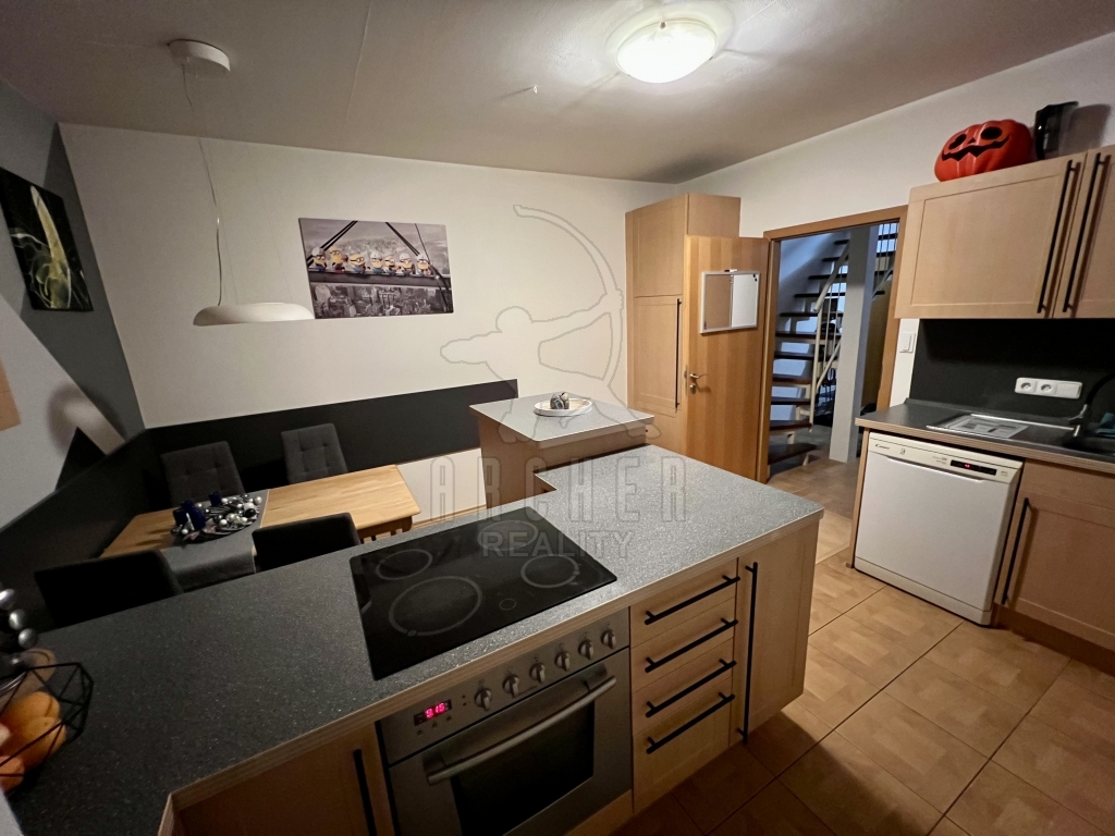 Ze společných prostor vstupujeme do podélné chodby, která slouží jako hlavní komunikační tepna mezi místnostmi prvního podlaží, zároveň zde nalezneme schody do poschodí. Je zde dostatek místa i pro úložné prostory. První poschodí nabízí zrcadlově dvě místnosti. Obytná kuchyně s praktickým ostrůvkem je vybavena všemi moderními spotřebiči, celkové řešení s jídelním koutem nabízí příjemnou společenskou atmosféru při přípravě pokrmů. Druhá místnost slouží jako klasický obývací pokoj, obohacený o ohromou vestavěnou skříň. Toto podlaží disponuje ještě velkou koupelnou s vanou a samostatnou toaletou. V prvním patře nalezneme celkem tři místnosti. Dvě podobné velikosti, z nichž jedna slouží jako ložnice a druhá jako velkorysá pracovna. Třetí místnost je volně k dispozici pro fantazii budoucího majitele. Všechna okna jsou orientována na západ, kde také nalezneme největší bonus této nabídky. K bytu je totiž k dispozici samostatná zahrada a navíc podíl na travnatém pozemku kol domu. Také k němu náleží dvě parkovací místa.
