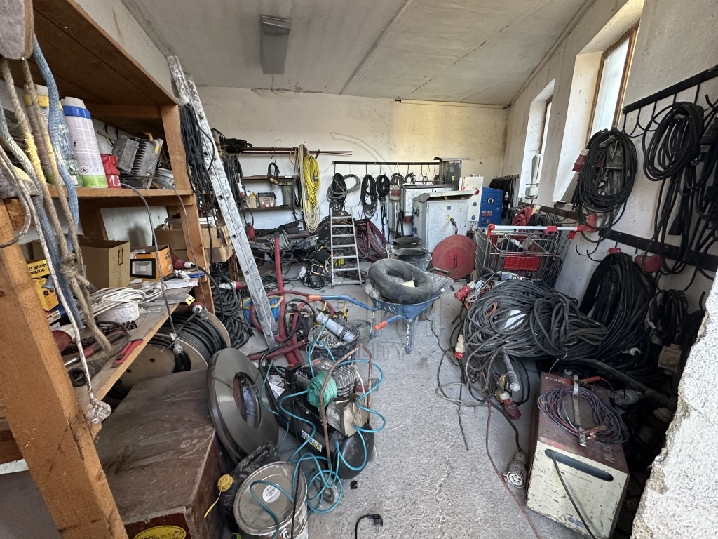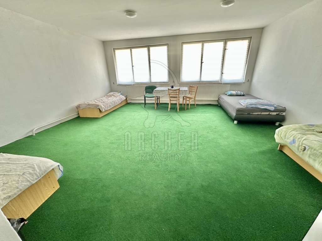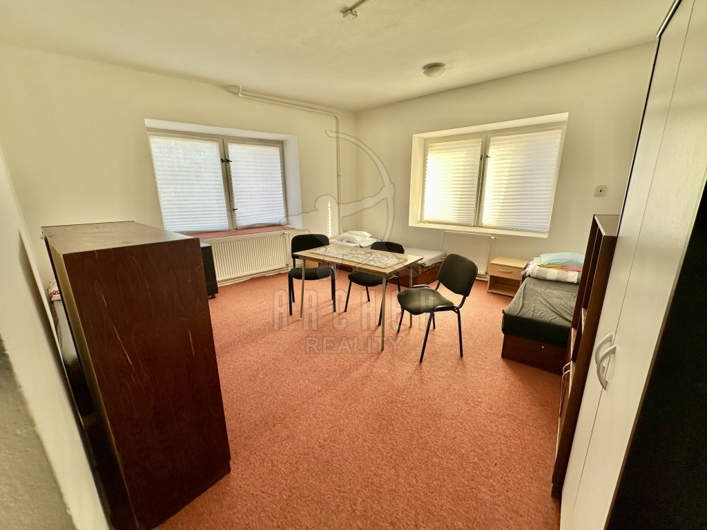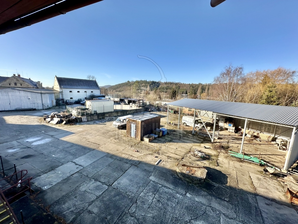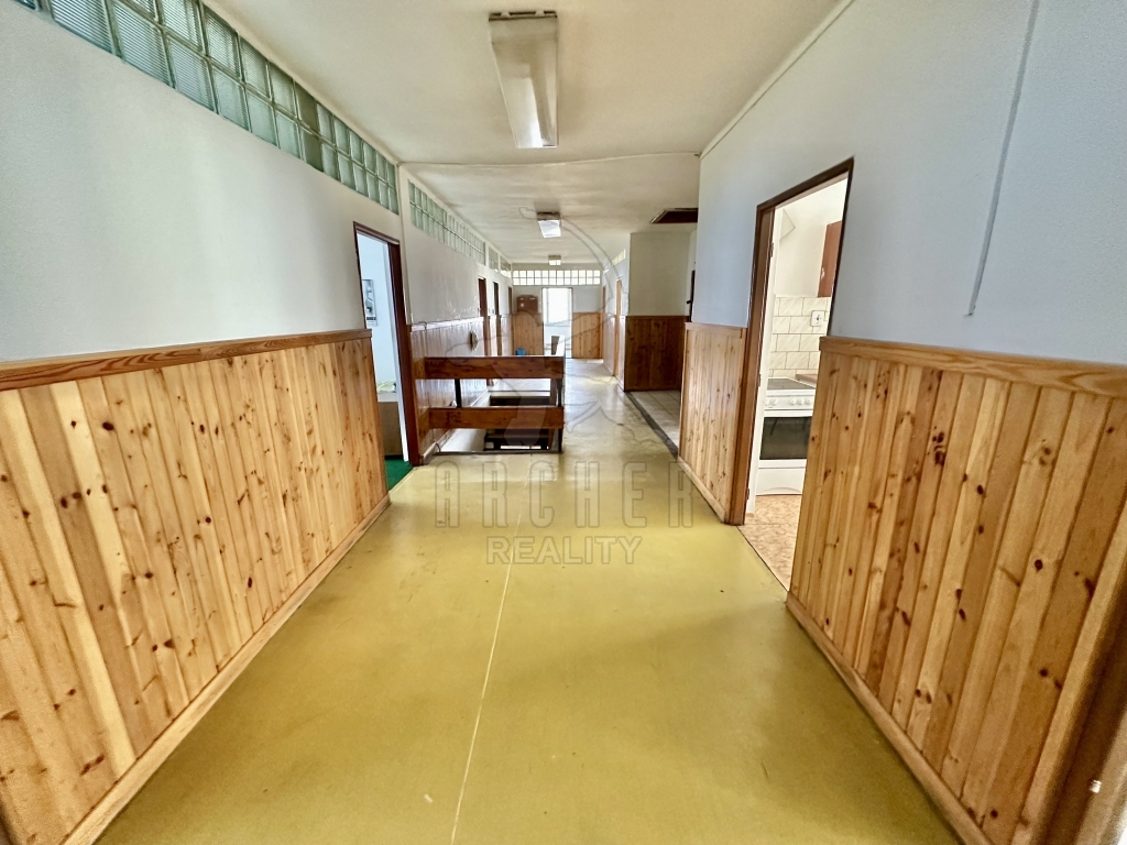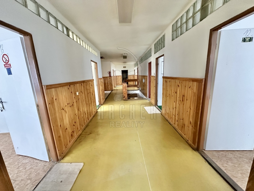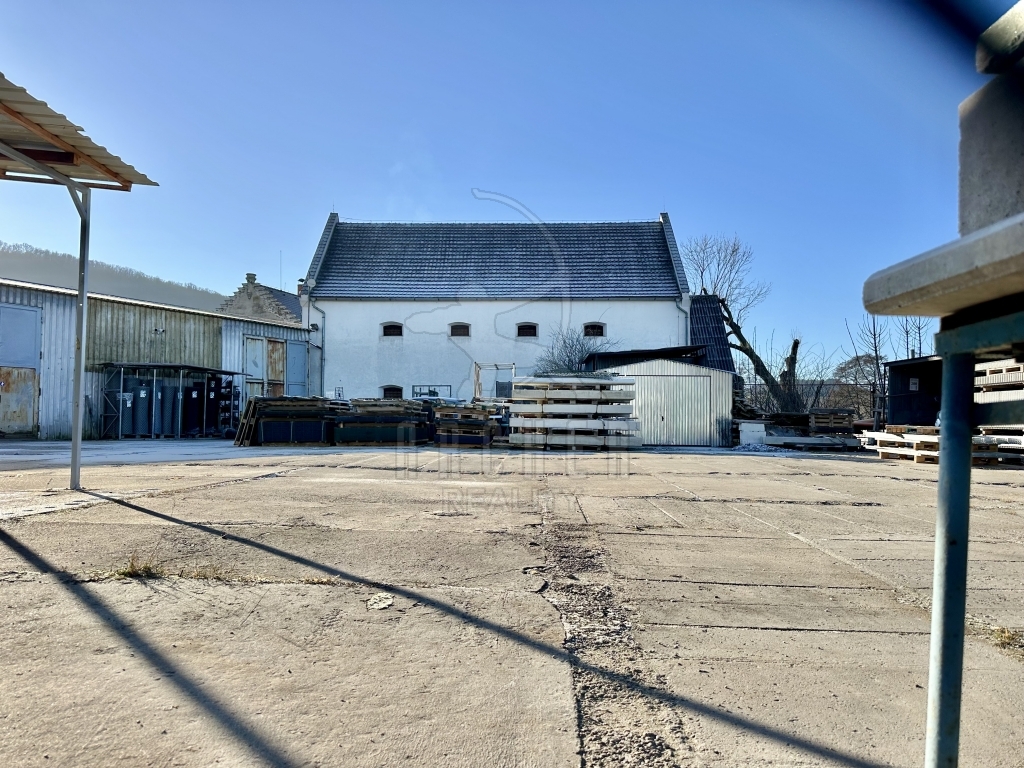 Velký patrový dům (ubytovna 17 pokojů + soc. zařízení a rozsáhlé sklepy), dvě velké výrobní haly a dvě garáže, dvě skladové haly a barokní sýpka v oploceném areálu se dvěma vjezdy.