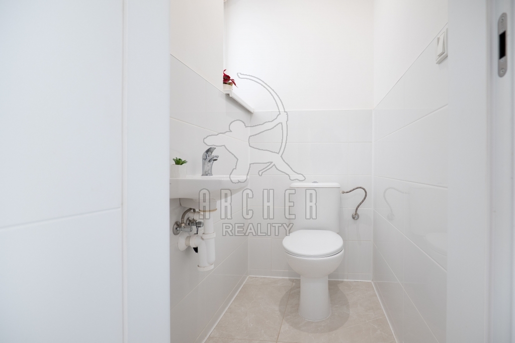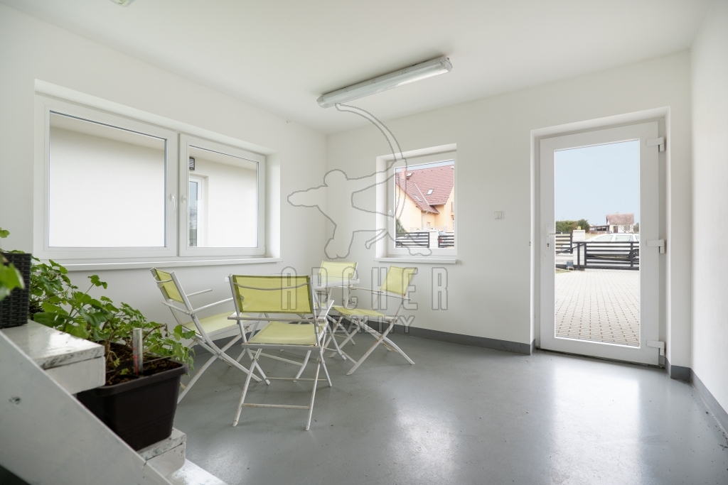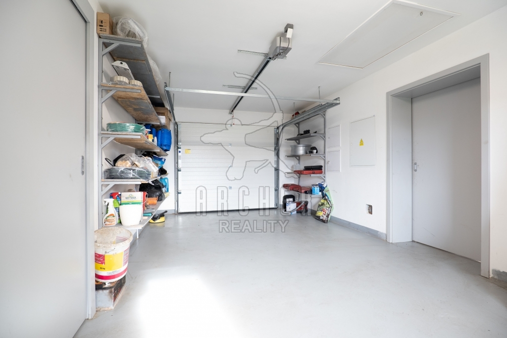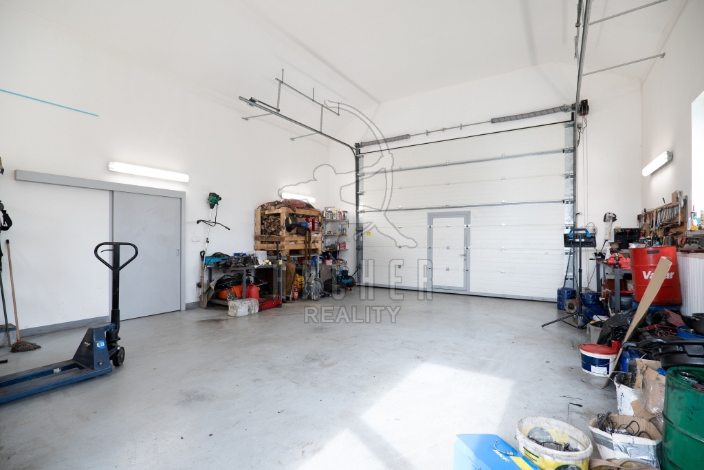 Benefitem je samostatná dvojgaráž s kanceláří, sociálním zařízením (sprcha/ toaleta) a technickou místností. Lze využít jako dílnu nebo sklad. Výška vjezdu 3,5m.