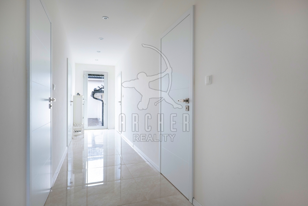 Dům nabízí prostornou vstupní chodbu s vestavěnými skříněmi, s přímým vstupem do přilehlé garáže (1 vůz). Chodba vede do velkoryse řešeného, světlého obývacího pokoje (haly) s plně vybaveným kuchyňským koutem (sklokeramická deska, elektrická trouba, digestoř, myčka, lednice s mrazákem), s přímým vstupem na krytou zahradní terasu s posezením. Součástí obývacího pokoje je krb na dřevo, dotvářející příjemnou atmosferu domova. 2 dětské pokoje jsou s přímými vstupy na terasu, oddělená ložnice. Nedílnou součástí je prostorná koupelna s vanou, sprchovým koutem, toaletou, bidetem, umyvadlem a tepelným žebříkem. Zvláště je pak umístěna spižírna a samostatná toaleta (pro hosty). Podlahová krytina tvořena laminátovou plovoucí podlahou a dlažbou.Nadstandardní interierové dveře (s magnetickým dovíráním) s obložkami.