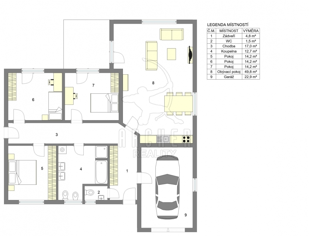 | Popis vybavení domu | Kuchyňská linka vč. elektro spotřebičů (sklokeramická deska, elektrická trouba, digestoř, myčka, lednice s mrazákem), vestavěné skříně, nábytek po dohodě. |