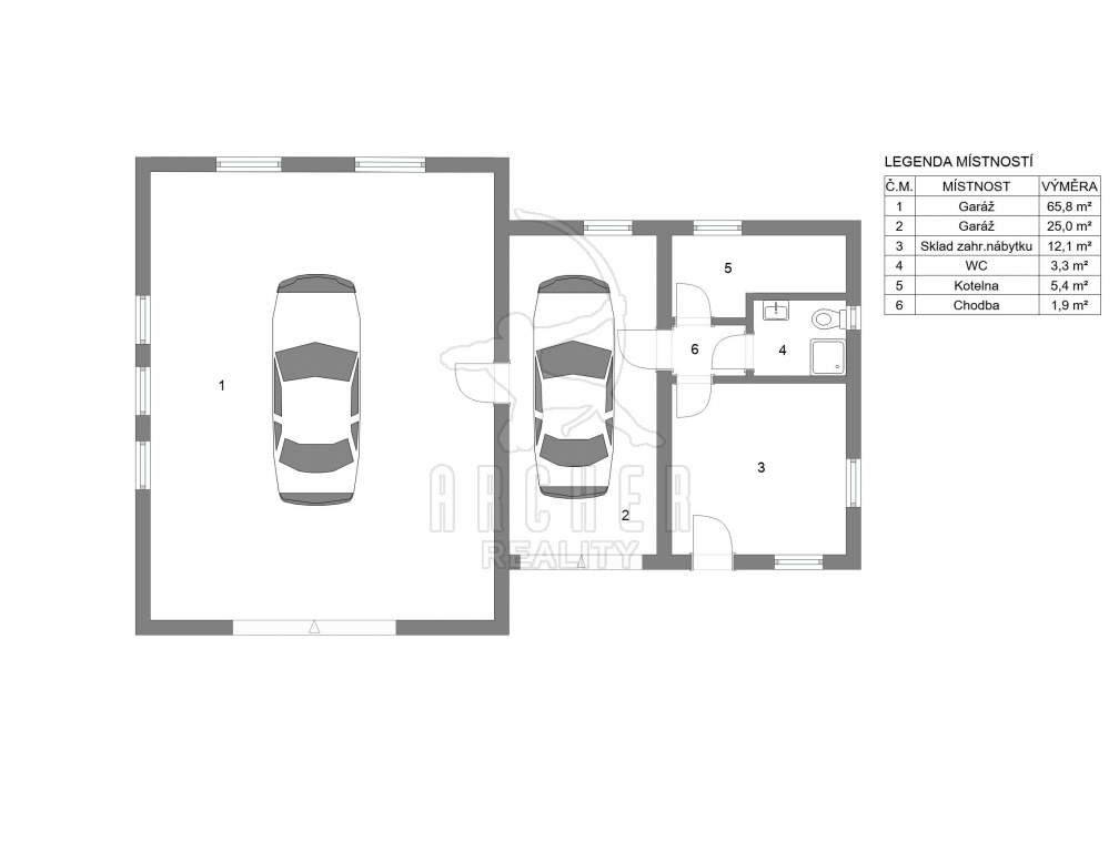 Benefitem je samostatná dvojgaráž s kanceláří, sociálním zařízením (sprcha/ toaleta) a technickou místností. Lze využít jako dílnu nebo sklad. Výška vjezdu 3,5m.