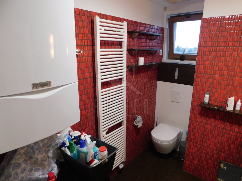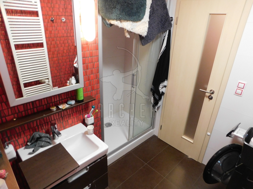 Designová koupelna se sprchovým koutem je zařízená předměty Villeroy & Boch a doplněna baterií a sprchovým setem Hansa. V koupelně je vestavěný stropní zvukový systém Sonos. V koupelně je umístěn plynový kotel, který zajišťuje vytápění a ohřev teplé vody dle individuální potřeby.