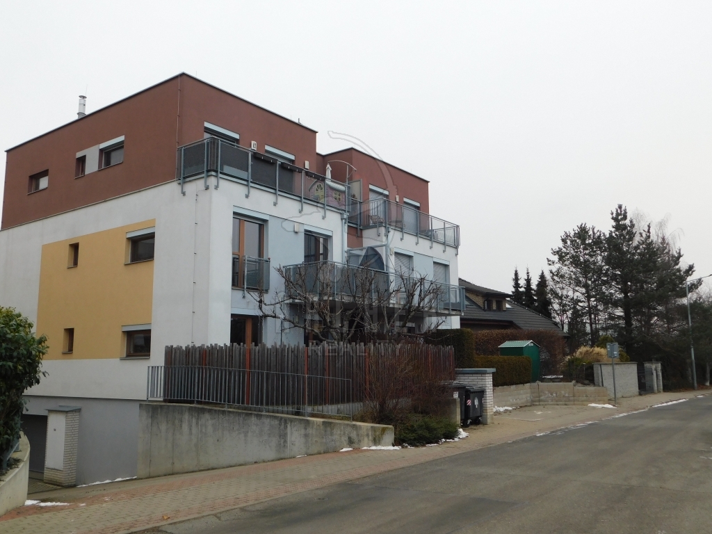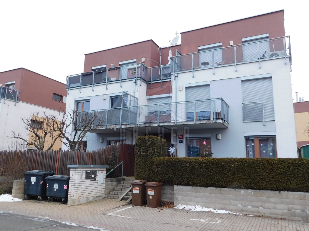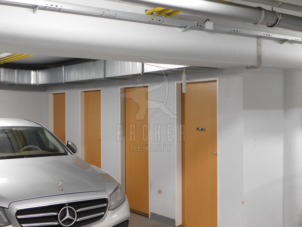 K bytu náleží jedno garážové stání a velký zděný sklep s pevnými regály v prostoru garáží.