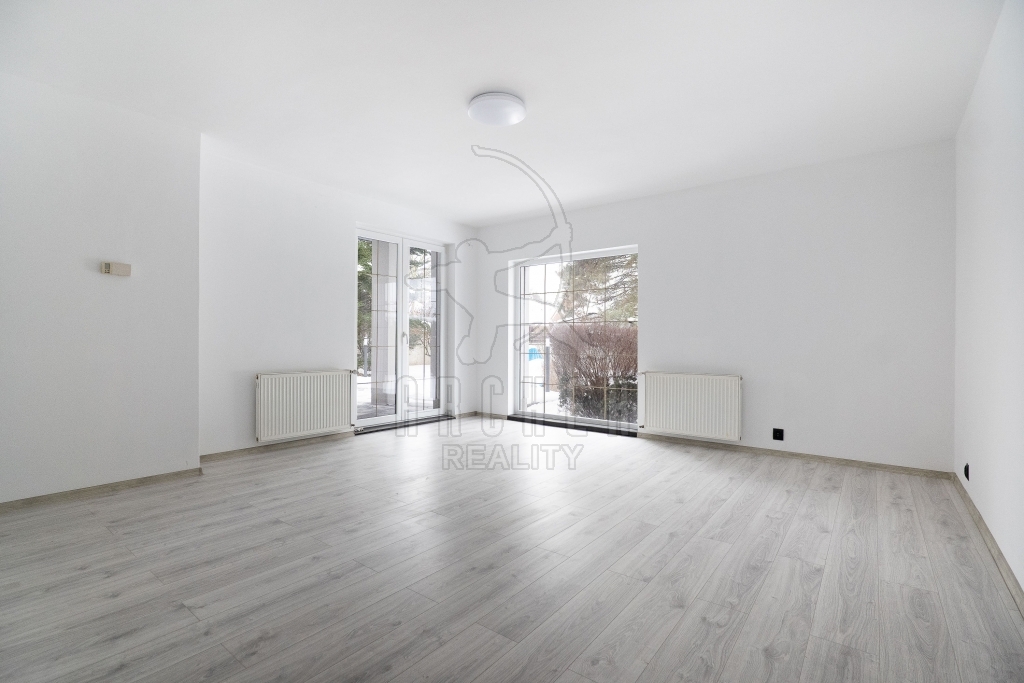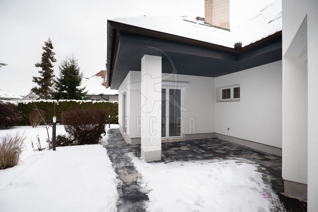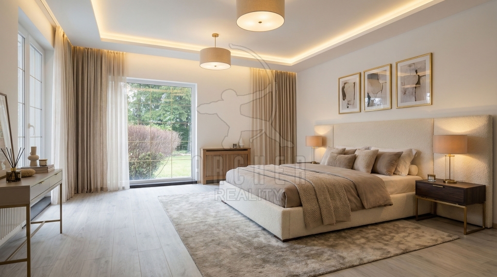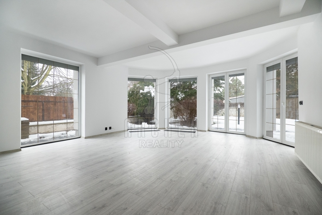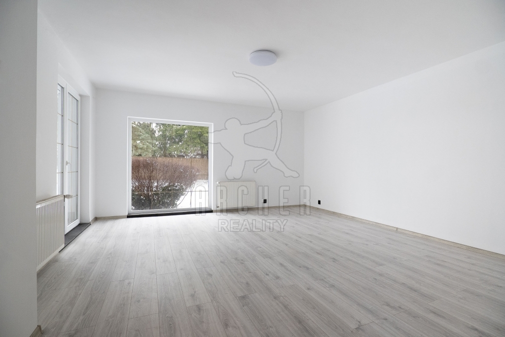 Přízemí nabízí vstupní zádveří, prostornou halu se schodištěm a velkorysý, světlý a klimatizovaný obývací pokoj s velkými okny, dostatkem přirozeného světla a přímým vstupem na udržovanou zahradu s posezením. Součástí je samostatná plně vybavená kuchyň včetně elektrospotřebičů, spíž propojená s garáží, ložnice, pracovna, koupelna se sprchovým koutem a toaletou a technická místnost s elektrokotlem a bojlerem.