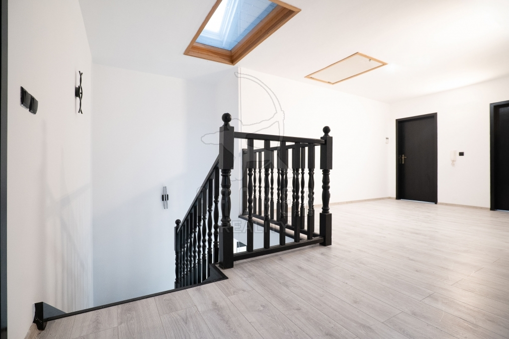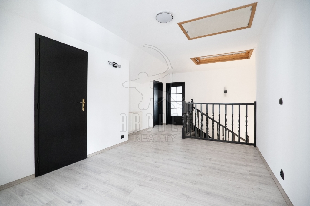 První patro, propojené dřevěným schodištěm, nabízí 3 neprůchozí pokoje, 2 koupelny s oknem (vana, rohová vana, sprchový kout a toaleta). Z ložnice je přímý vstup na terasu s výhledem do klidného okolí. Dominantou patra je prostorná galerie, vkusně prosvětlená střešním oknem. Dále se zde nachází prádelna (technická místnost) a komora.