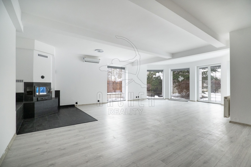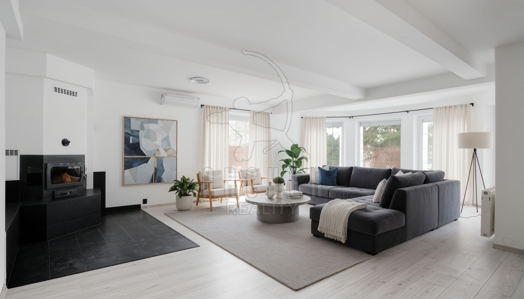 Příjemnou atmosféru interiéru podtrhuje moderní krb s teplovodním výměníkem, sloužící i pro vytápění a ohřev vody.