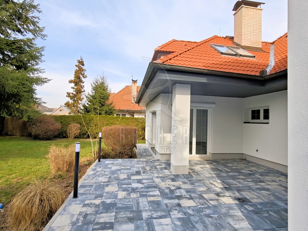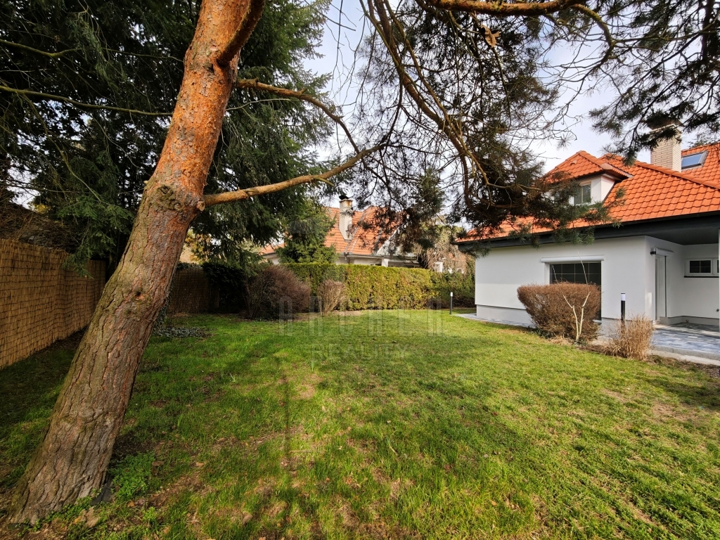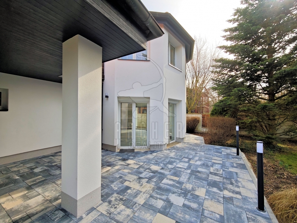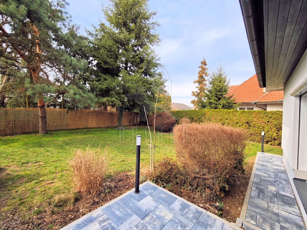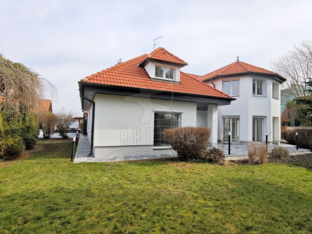 Přízemí nabízí vstupní zádveří, prostornou halu se schodištěm a velkorysý, světlý a klimatizovaný obývací pokoj s velkými okny, dostatkem přirozeného světla a přímým vstupem na udržovanou zahradu s posezením. Součástí je samostatná plně vybavená kuchyň včetně elektrospotřebičů, spíž propojená s garáží, ložnice, pracovna, koupelna se sprchovým koutem a toaletou a technická místnost s elektrokotlem a bojlerem.