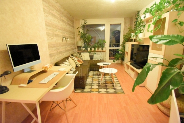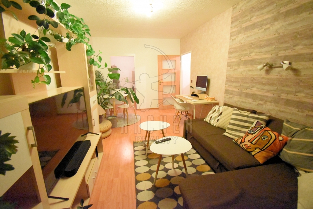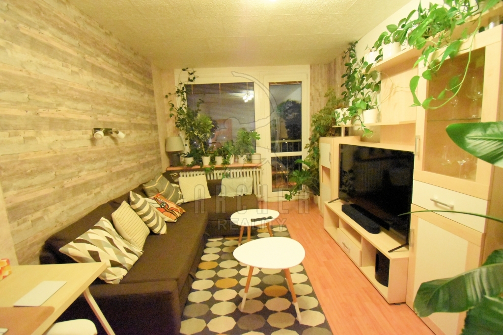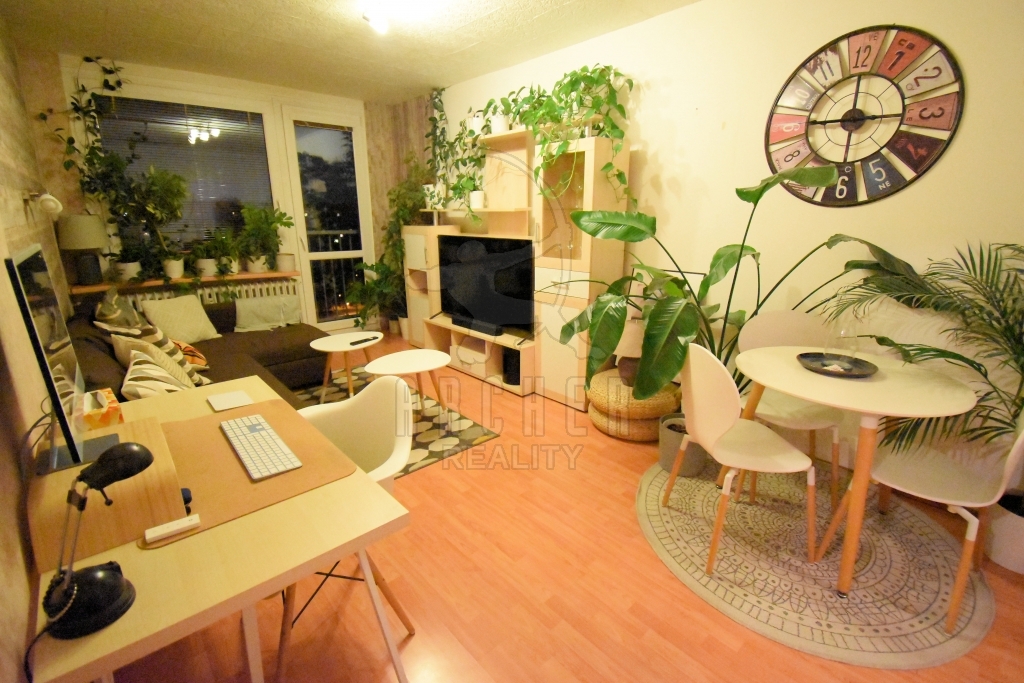 Dispozičně jej tvoří vstupní chodba, obývací pokoj s kuchyňskou částí, ložnice, koupelna se sprchovým koutem a samostatné WC. Díky orientaci oken na jihozápad je byt velmi slunný.
