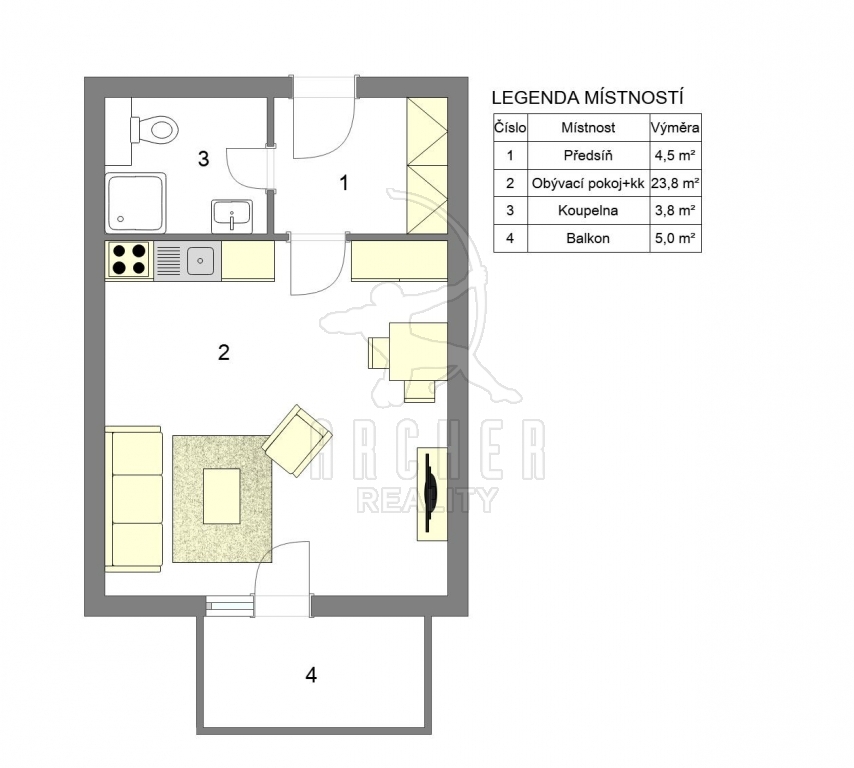 Dispozice zahrnuje vstupní předsíň s vestavěnými skříněmi, obývací pokoj s vybaveným kuchyňským koutem (sklokeramická dvojplotýnka, digestoř, vestavěná lednice) a s přímým vstupem na balkon. Koupelna vybavena sprchovým koutem a pračkou, toaleta je součástí koupelny. Jižní orientace, plastová okna, Na podlaze linoleum v kombinaci s dlažbou. Vytápění (radiátory) a ohřev vody je zajištěno ústřední dálkové. Byt je ve velmi dobrém, udržovaném stavu a nabízí nízké provozní náklady.