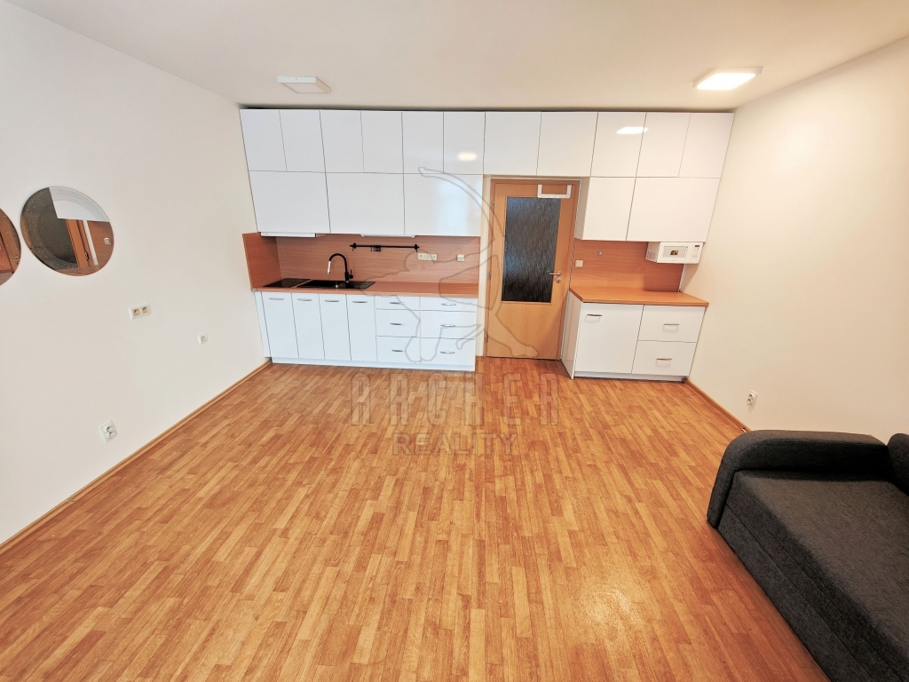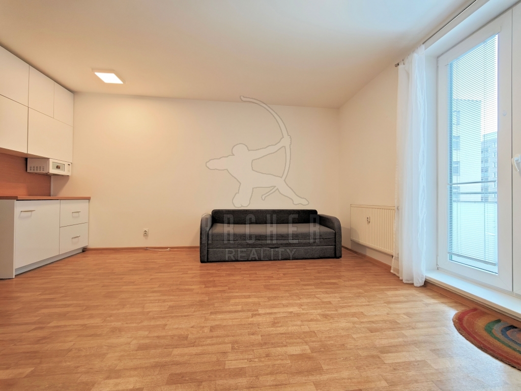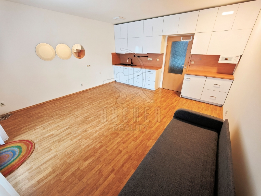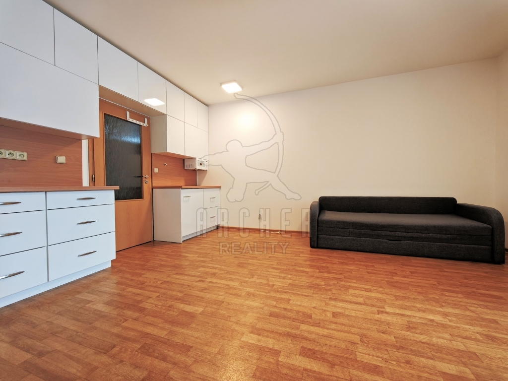 Dispozice zahrnuje vstupní předsíň s vestavěnými skříněmi, obývací pokoj s vybaveným kuchyňským koutem (sklokeramická dvojplotýnka, digestoř, vestavěná lednice) a s přímým vstupem na balkon. Koupelna vybavena sprchovým koutem a pračkou, toaleta je součástí koupelny. Jižní orientace, plastová okna a plovoucí laminátová podlaha v kombinaci s dlažbou. Vytápění (radiátory) a ohřev vody je zajištěno ústřední dálkové. Byt je ve velmi dobrém, udržovaném stavu a nabízí nízké provozní náklady.