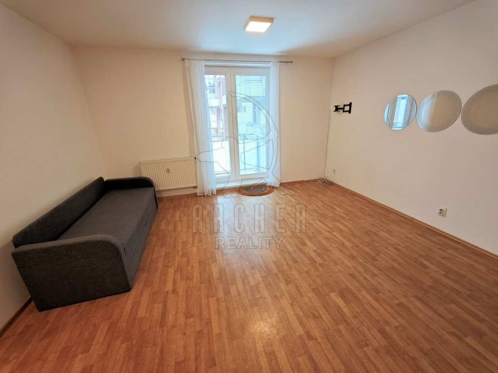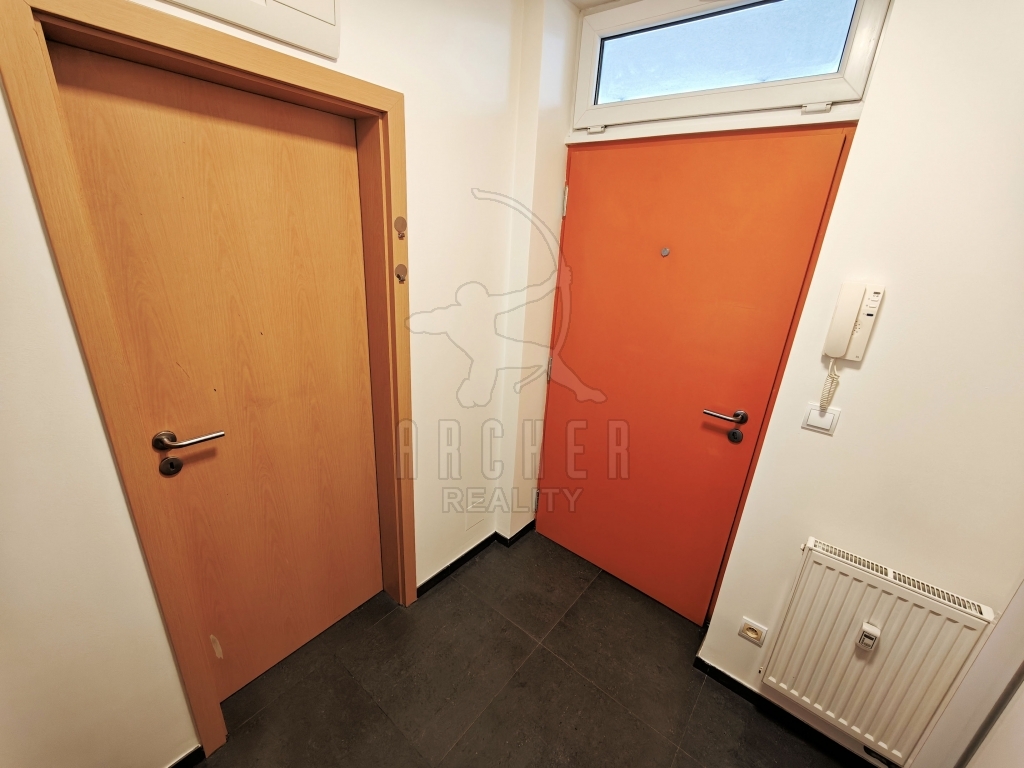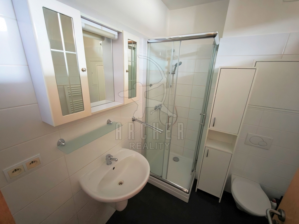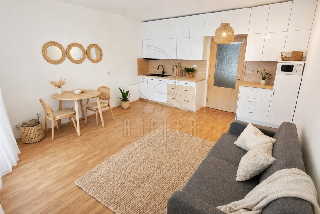 Dispozice zahrnuje vstupní předsíň s vestavěnými skříněmi, obývací pokoj s vybaveným kuchyňským koutem (sklokeramická dvojplotýnka, digestoř, vestavěná lednice) a s přímým vstupem na balkon. Koupelna vybavena sprchovým koutem a pračkou, toaleta je součástí koupelny. Jižní orientace, plastová okna a plovoucí laminátová podlaha v kombinaci s dlažbou. Vytápění (radiátory) a ohřev vody je zajištěno ústřední dálkové. Byt je ve velmi dobrém, udržovaném stavu a nabízí nízké provozní náklady.