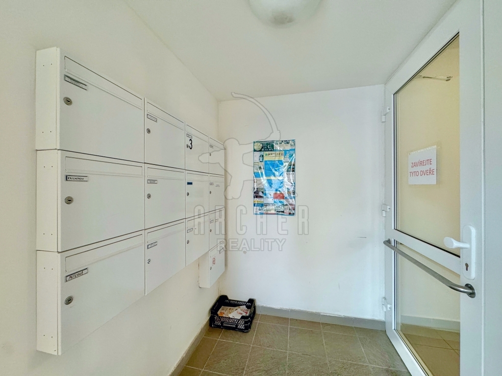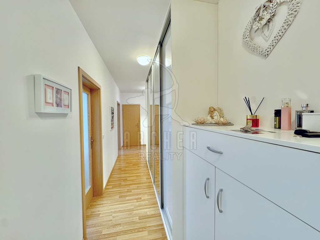 Vstup do bytu je zajištěn bezpečnostními - protihlukovými dveřmi. Rozlehlá chodba spojuje všechny místnosti v bytě. Byt je kolaudovaný jako 3+kk, ale rozdělení první ložnice vznikly dvě místnosti, první má 7,1m2 a druhá 9,1m2. Menší je možné využít jako pracovnu a větší je nyní užívána jako menší ložnice. Dalším pokojem je velká ložnice. Před ní je chodba velmi rozšířená a je v ní umístěna knihovna. Je zde vstup do koupelny s vanou, dvojitým umyvadlem, pračkou a sušičkou. Toaleta je v samostatné místnosti.
