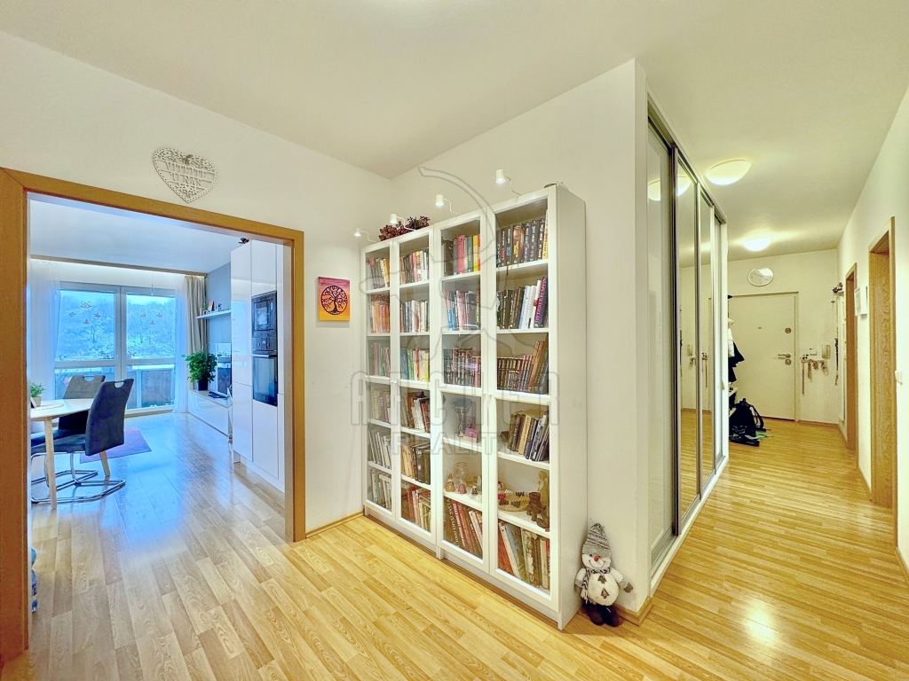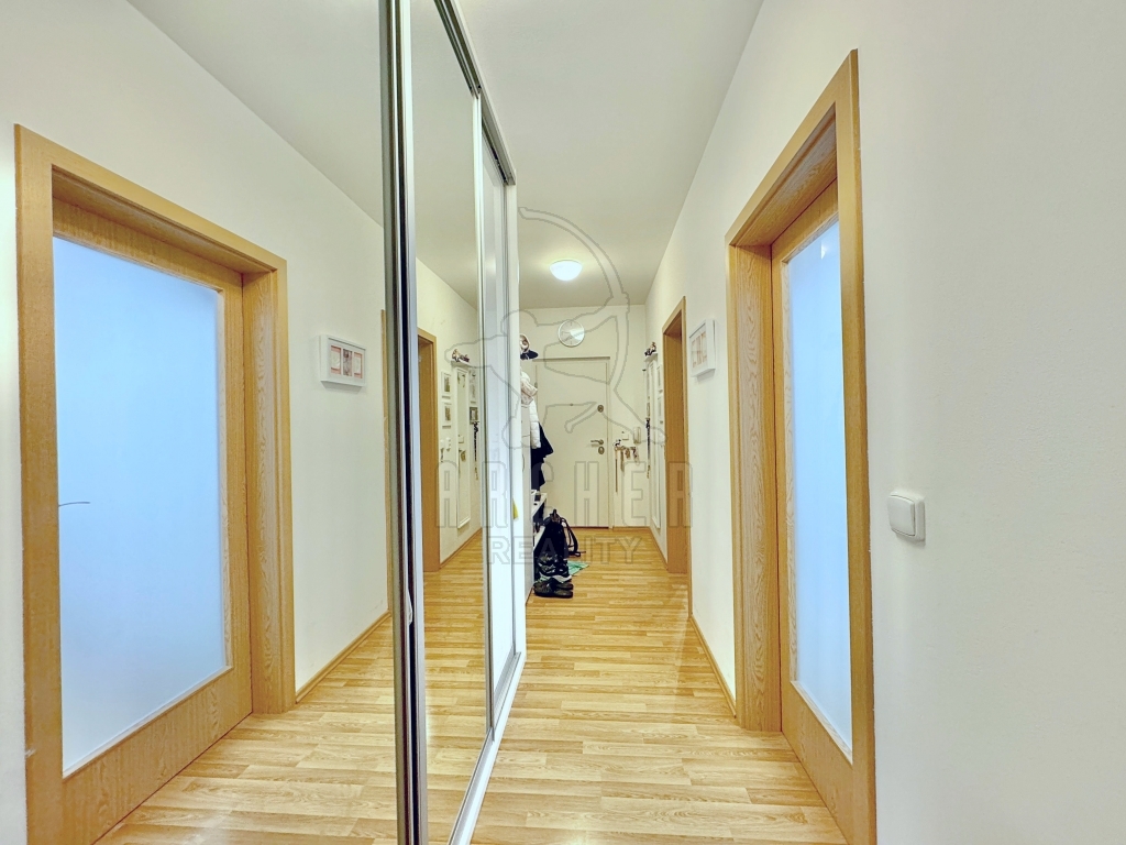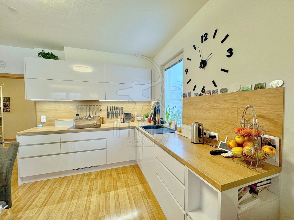 | Popis vybavení bytu | Designová kuchyňská linka z roku 2022 s vestavnými spotřebiči ve vysoké kvalitě a s velmi tichým provozem: indukční varná deska, horkovzdušná trouba, mikrovlnka, myčka, lednice, mrazák. Velké vestavěné skříně se zrcadlovými posuvnými dveřmi, knihovna s osvětlením a prosklenými dvířky. |